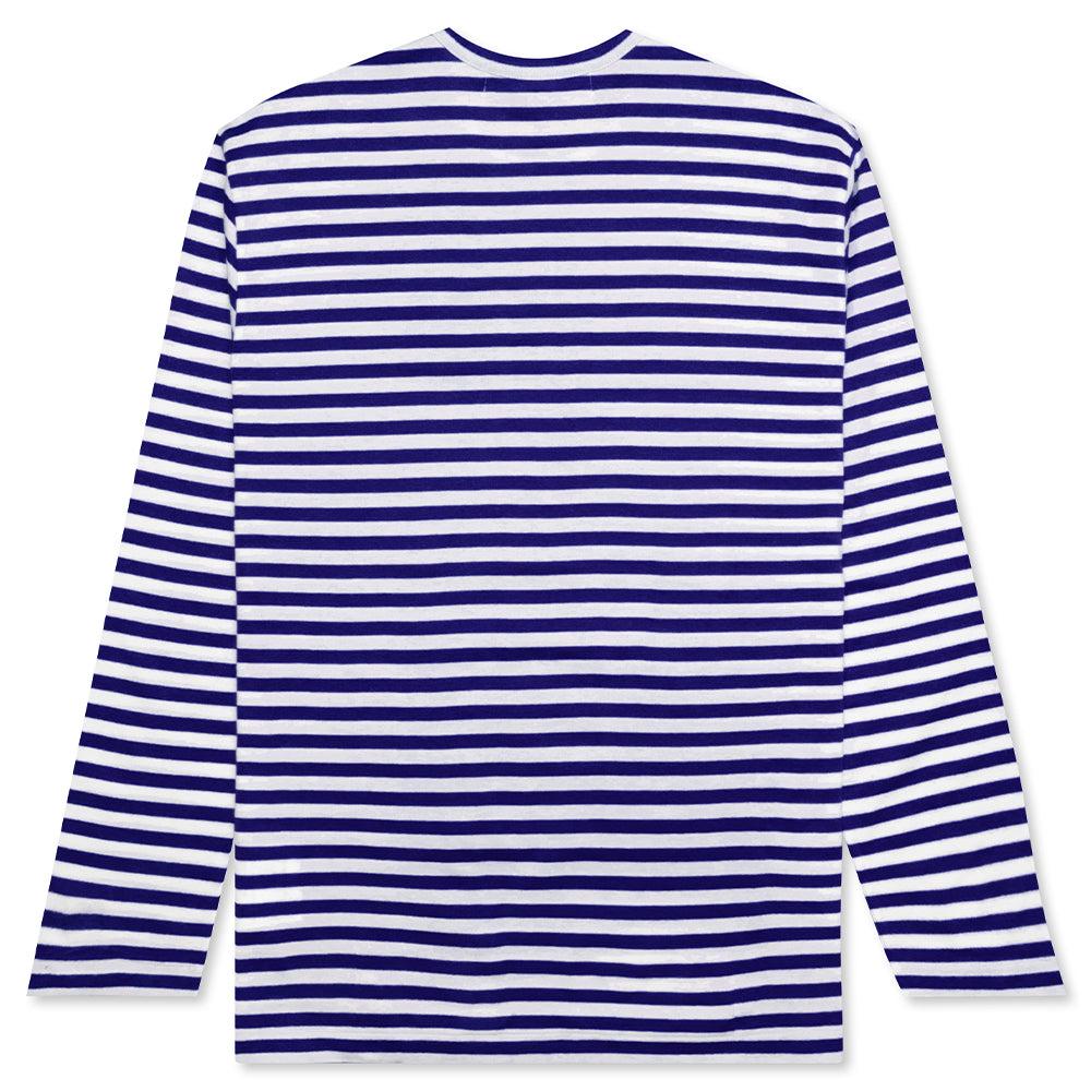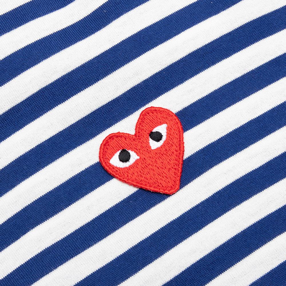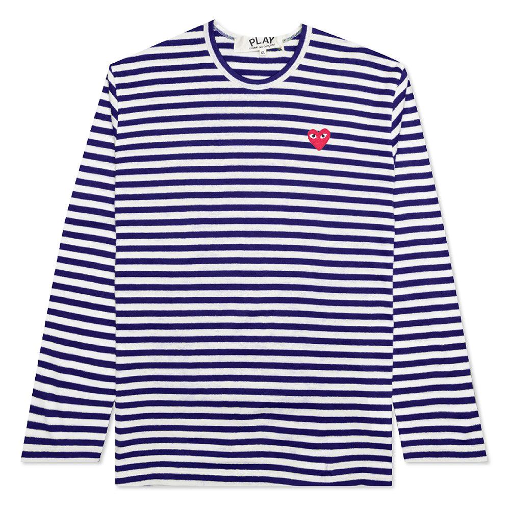The concept of the Comme des Garcons PLAY line is design by not designing. Characterized by the iconic red heart logo designed by artist Filip Pagowski, the line is a collection of unisex basics, fragrances, and footwear for those who enjoy simplicity. Pictured is the Comme des Garcons PLAY Striped Big Heart Long Sleeve T-Shirt in Blue/White. AZ T164 051 2 COMME DES GARCONS PLAY APPAREL HAS A SMALLER FIT, WE RECOMMEND SIZING UP. THIS ITEM IS NOT ELIGIBLE FOR DISCOUNTS OR SPECIAL PROMOTIONS. 100% cotton Embroidered CDG heart logo Style no: AZ-T164-051-2 condition: new
