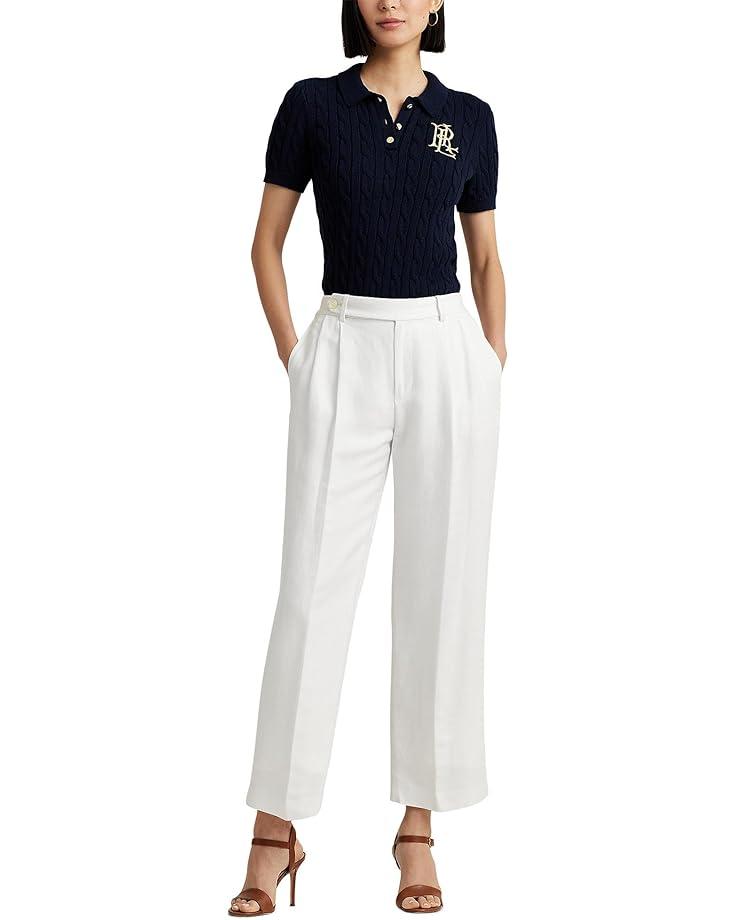 Make your fashion games more fun by donning the relaxing and slim-fitting LAUREN Ralph Lauren® Cable-Knit Cotton Polo Sweater with a ribbed polo collar and a three-buttoned placket featured with "LRL"-engraved buttons. The pullover style has short sleeves with ribbed cuffs and an "LRL"-embroidered logo on the left chest.