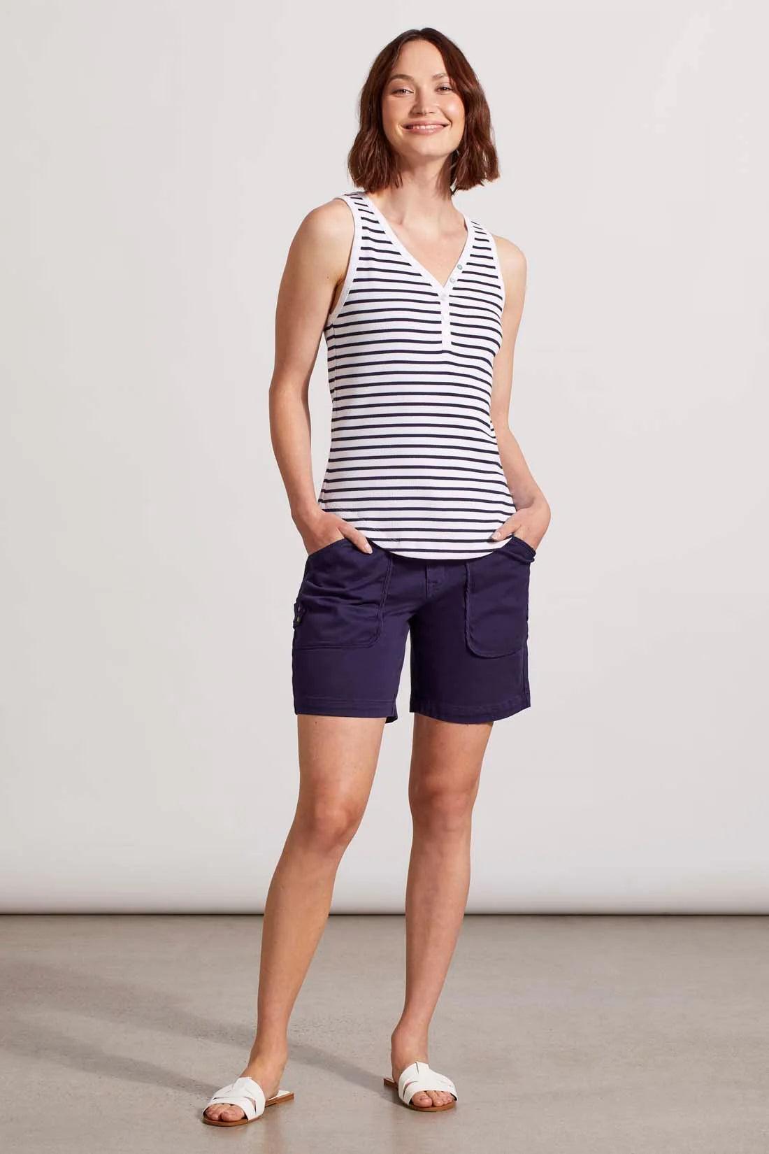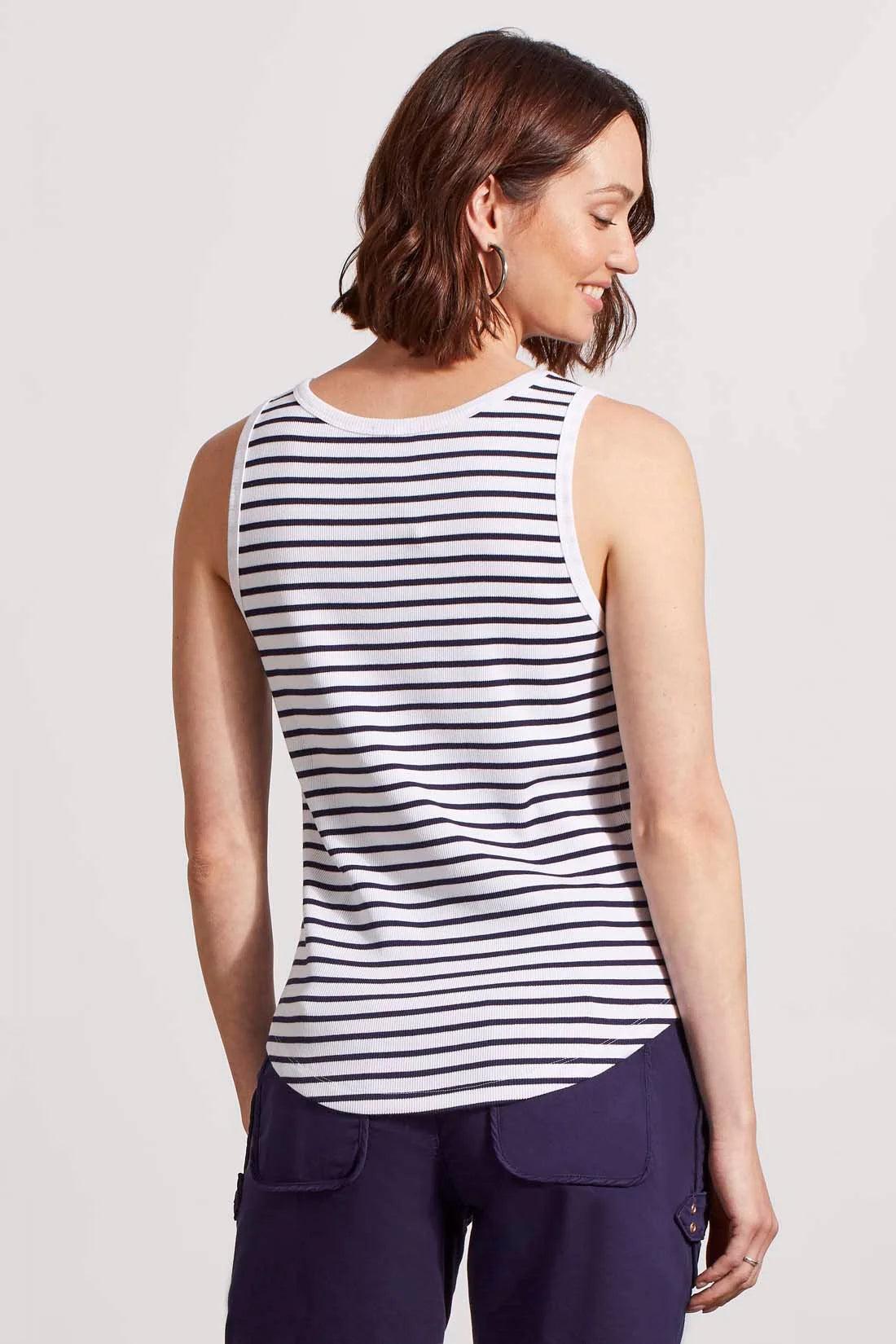 Build up your everyday basics with this endlessly versatile henley tank top. We love the pop-over v-neck embellished with shell buttons, slightly slim fit that follows your shape without constricting, curved hem, rib-knit fabric, and classic stripe print available in a variety of colors.