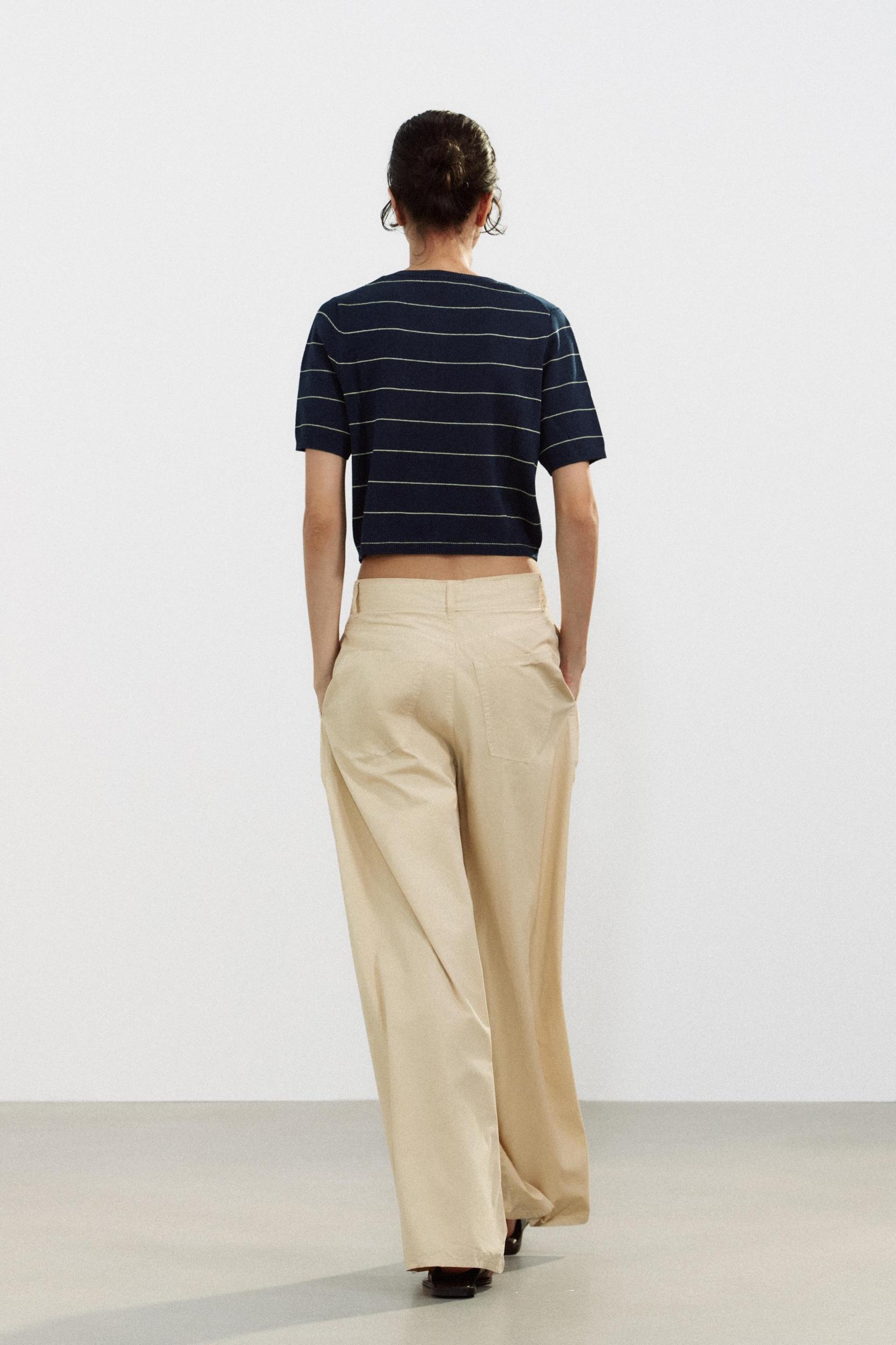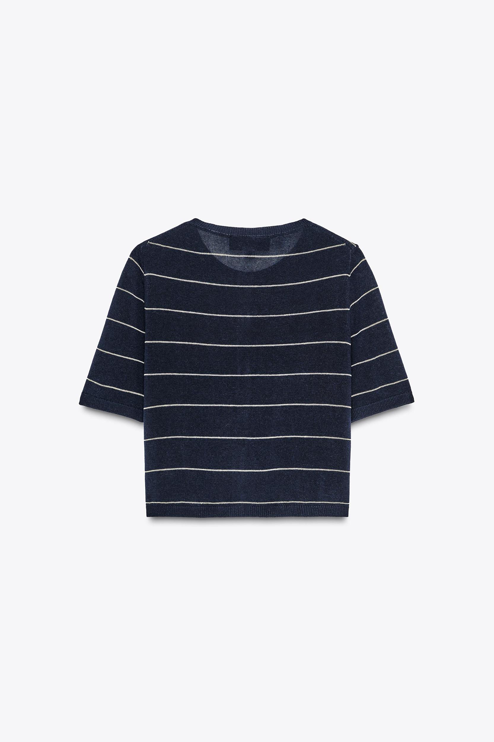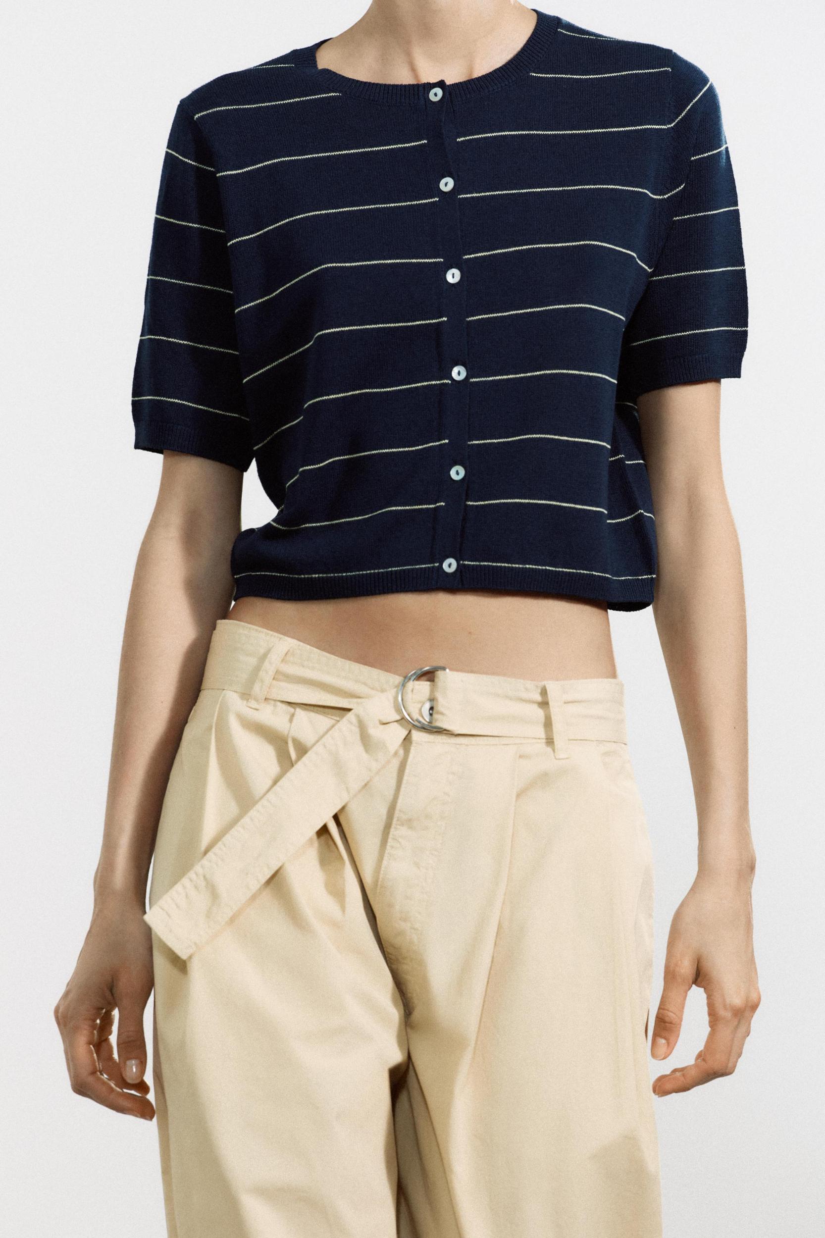 Cropped jacket made with 15% linen. Round neck and short sleeves. Front button closure.