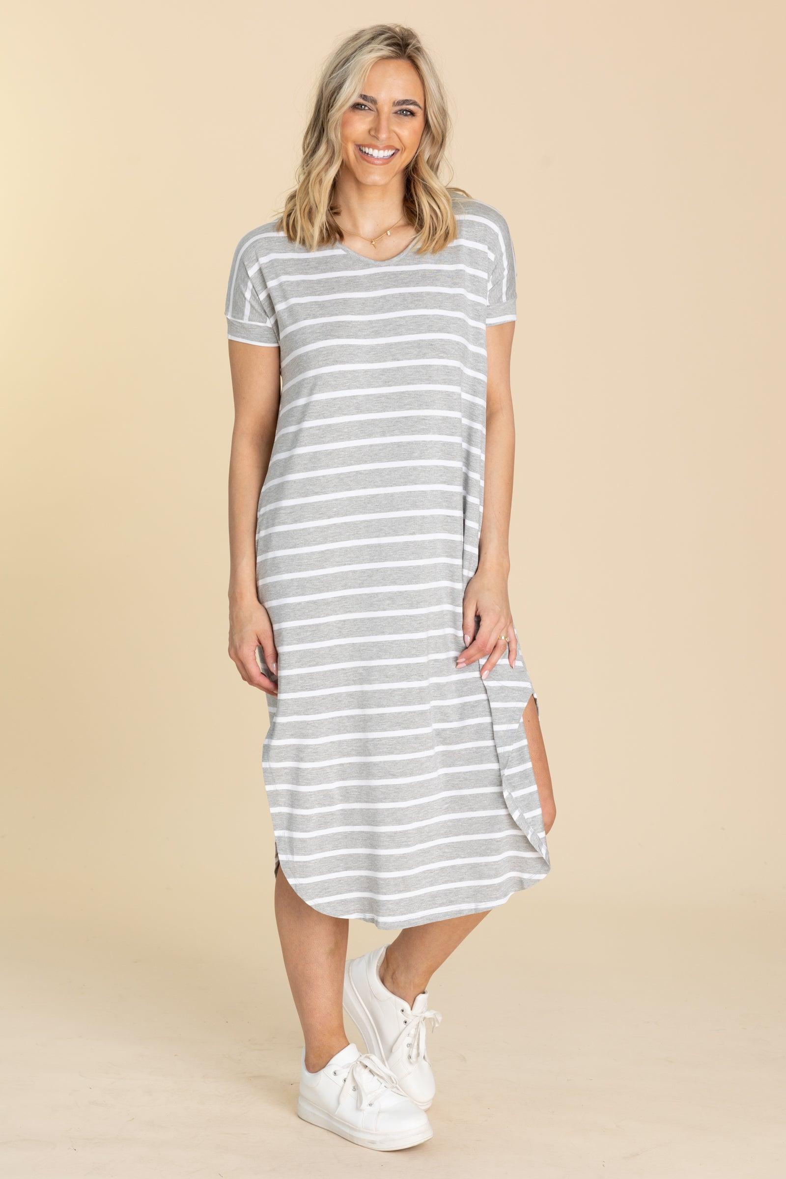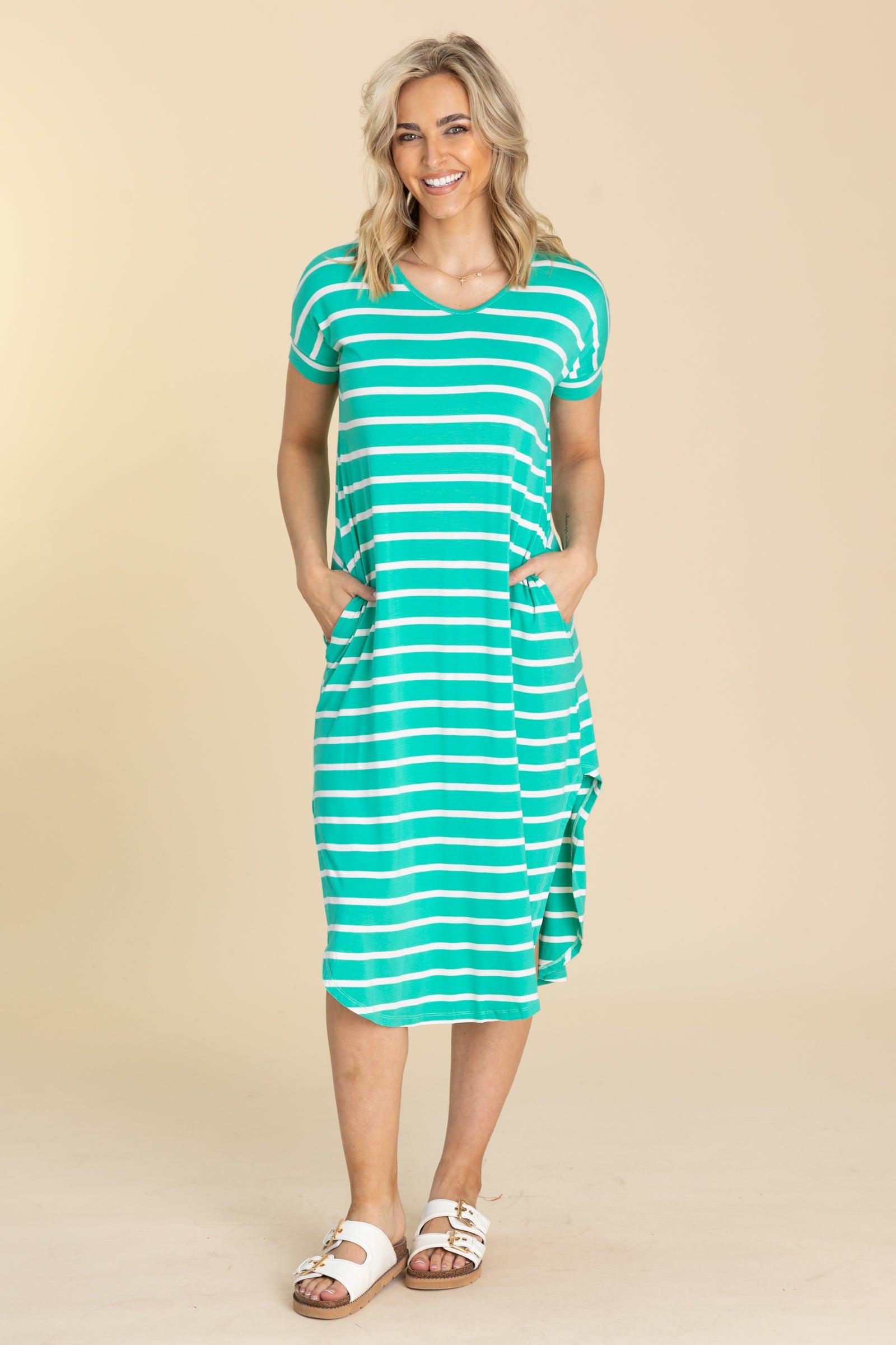 Product Details Colors: Black and White/ Navy and White/ Dusty Blue and White/ Dusty Rose and White/ Fuchsia and White/ Heather Grey and White/ Seafoam and White Print: Striped Neckline: Round Sleeve: Short Sleeve Hemline: Round Brand: Yelete Material and Care 95% Rayon 5% Spandex Hand Wash Cold Tumble Dry Low Size and Fit Small: Bust 42" Waist 40" Length 44.5" Medium: Bust 44" Waist 42" Length 45" Large: Bust 46" Waist 44" Length 45.5" X Large: Bust 48" Waist 46" Length 46" 2XL: Bust 50" Waist 48" Length 46.5" 3XL: Bust 52" Waist 50" Length 47" Courtney is 5’8” and wearing her true size large Sarah is 5'8" and wearing her true size small