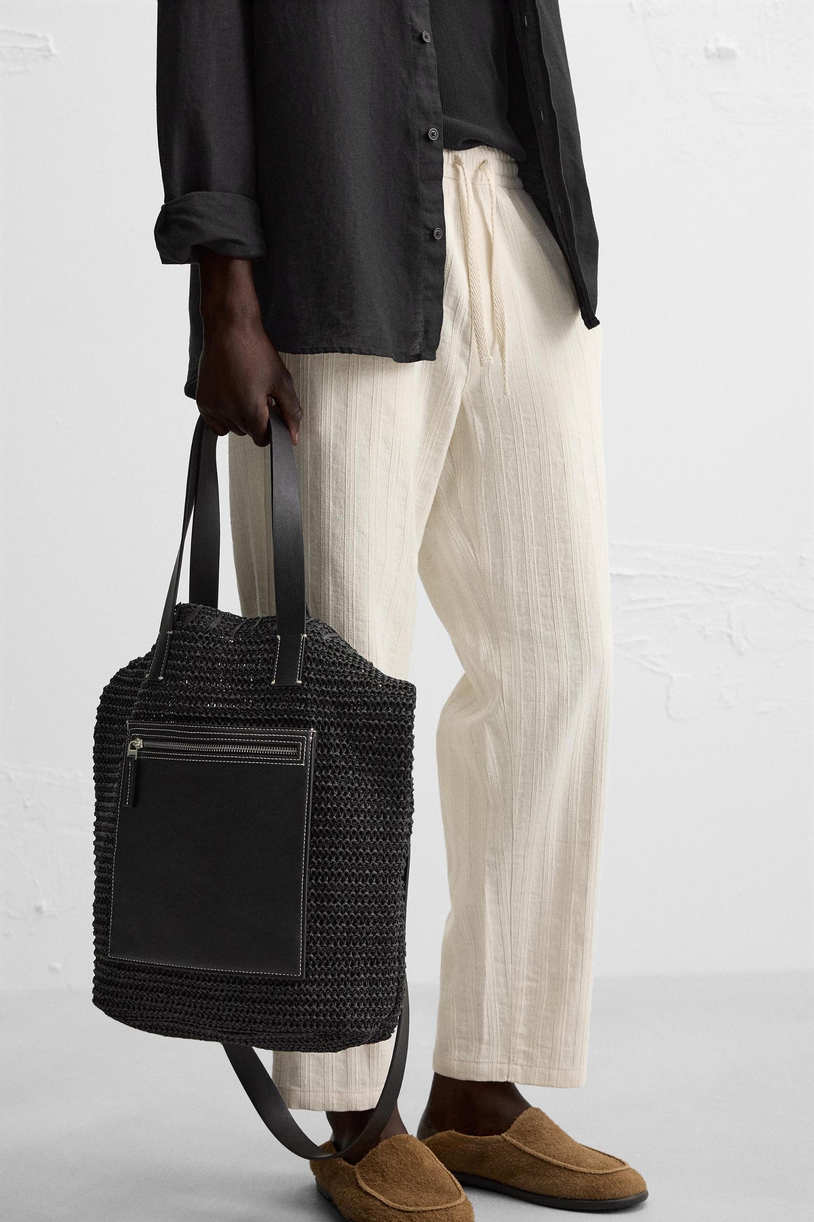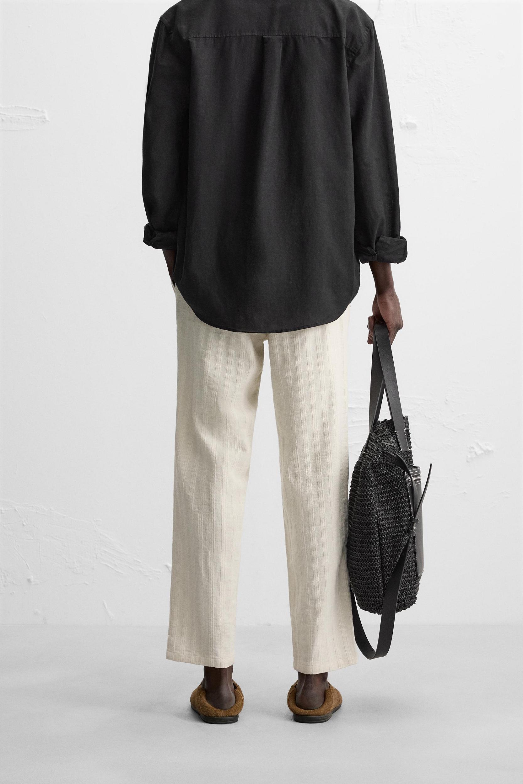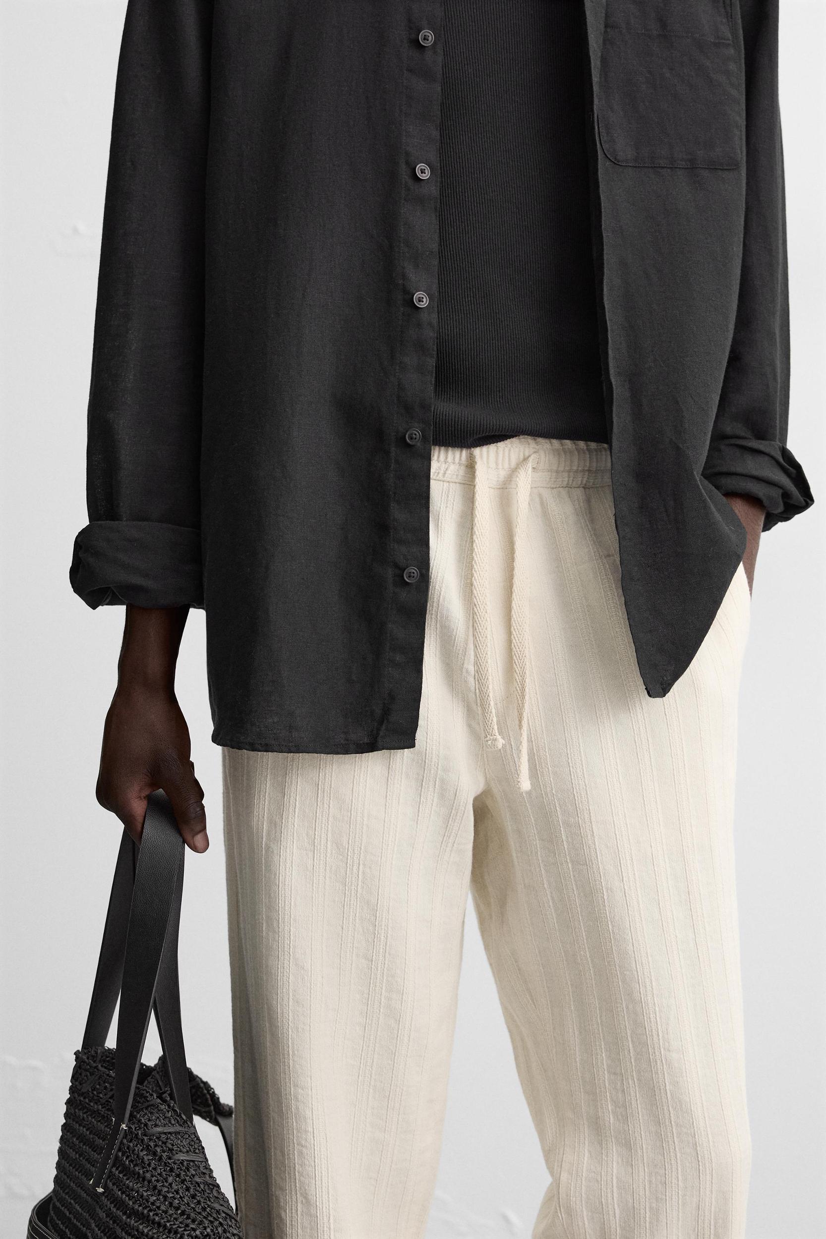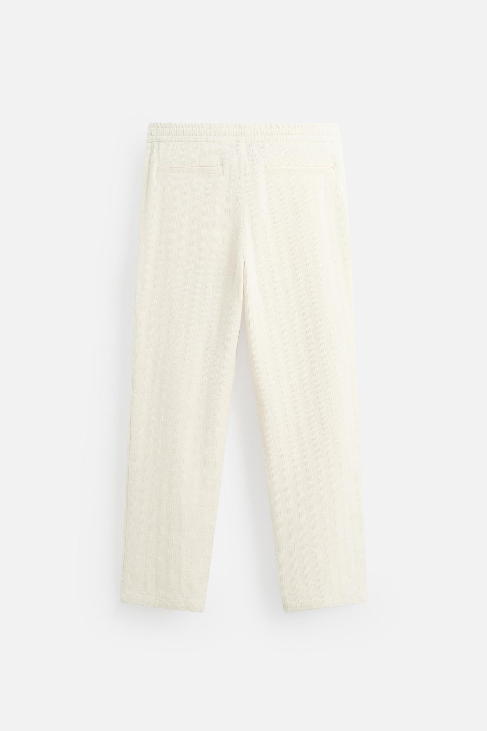 Regular fit pants made of a cotton blend fabric. Adjustable elastic drawstring waistband. Front pockets and back welt pockets.