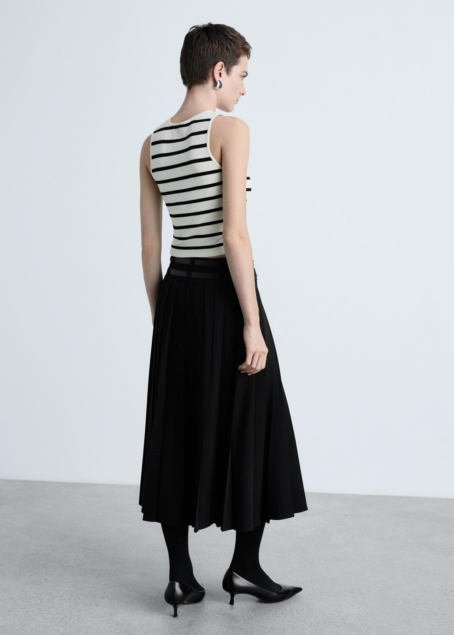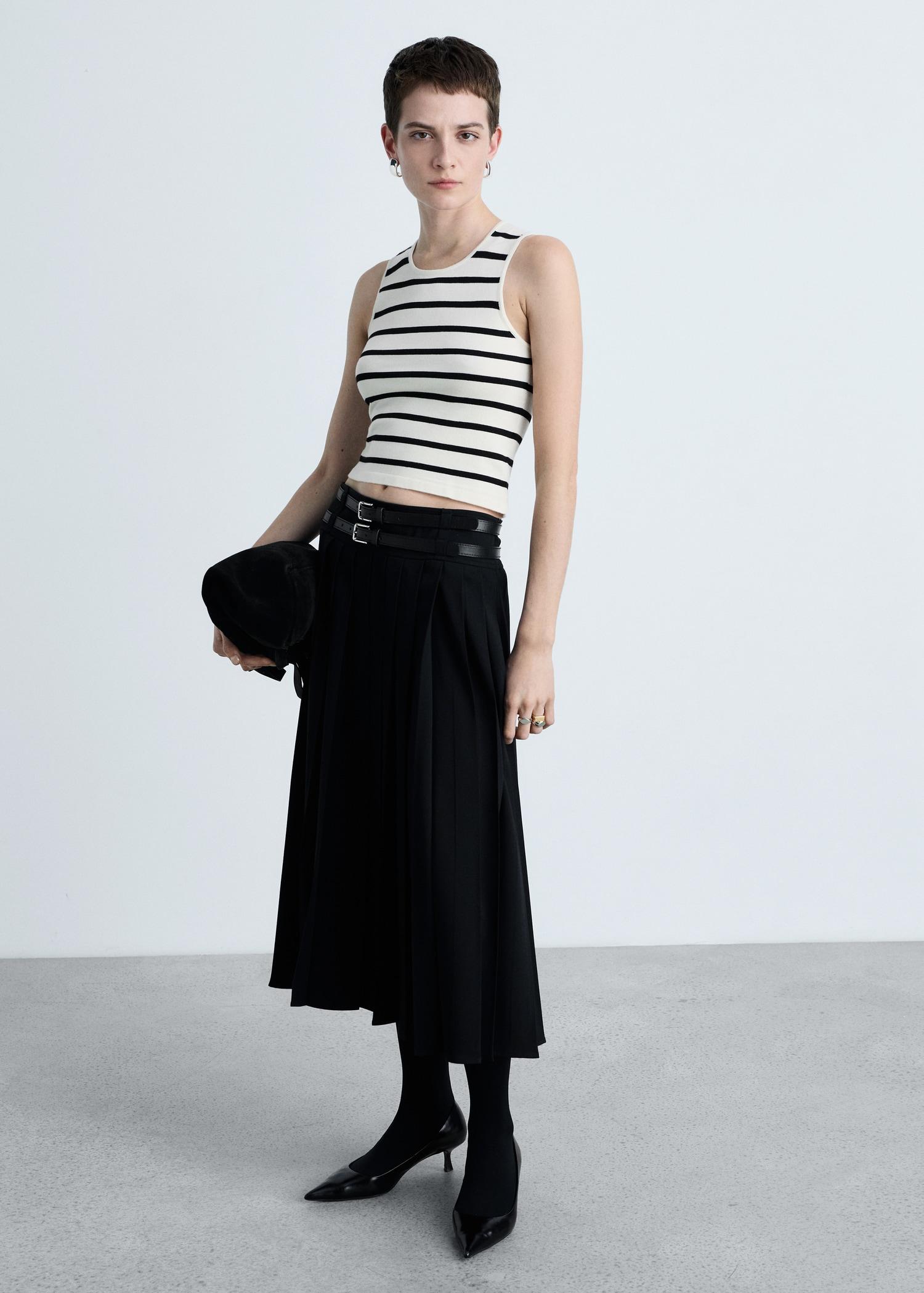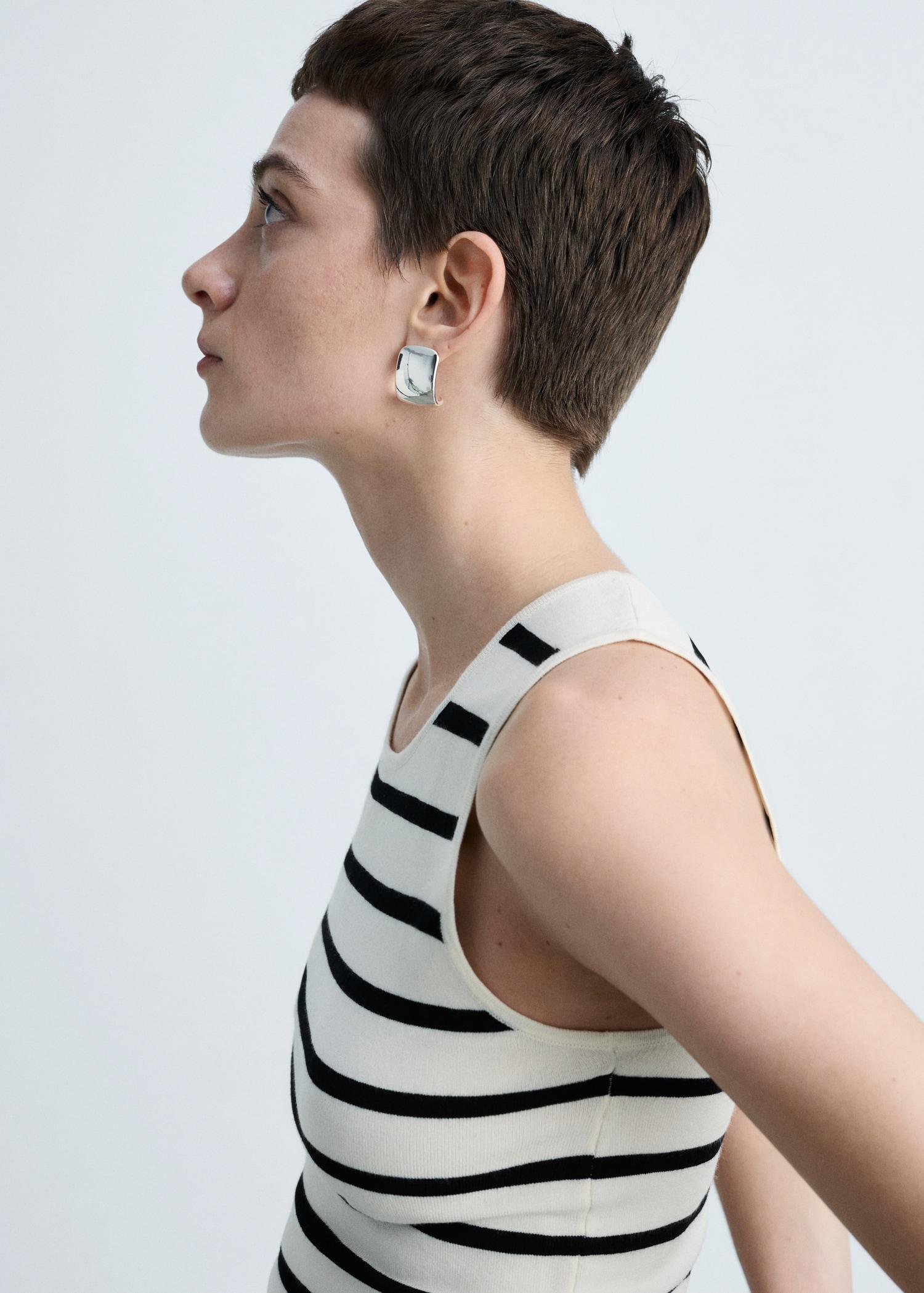 Fine knit fabric. Cropped design. Slim fit. Striped print. Round neck. Sleeveless. No closure