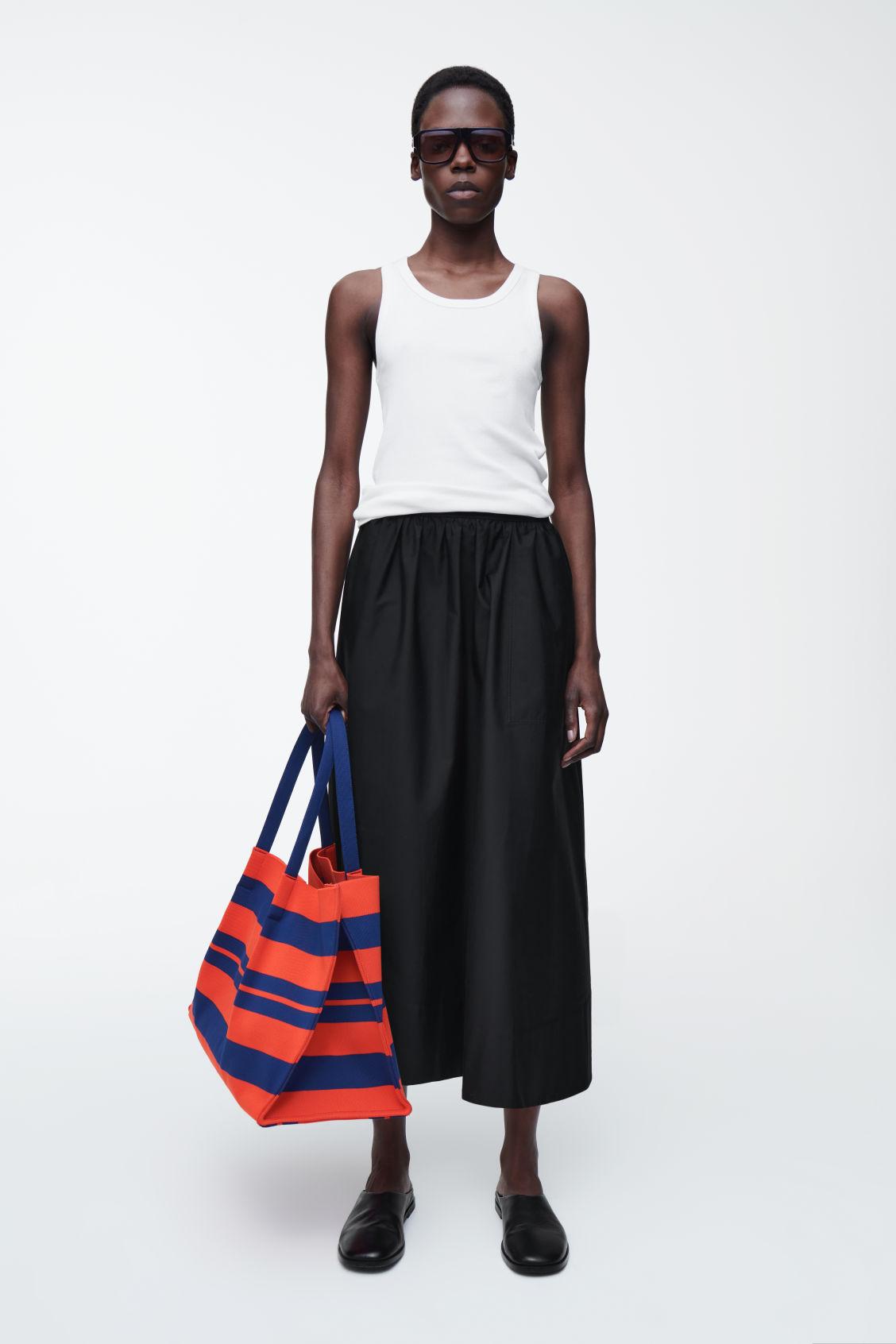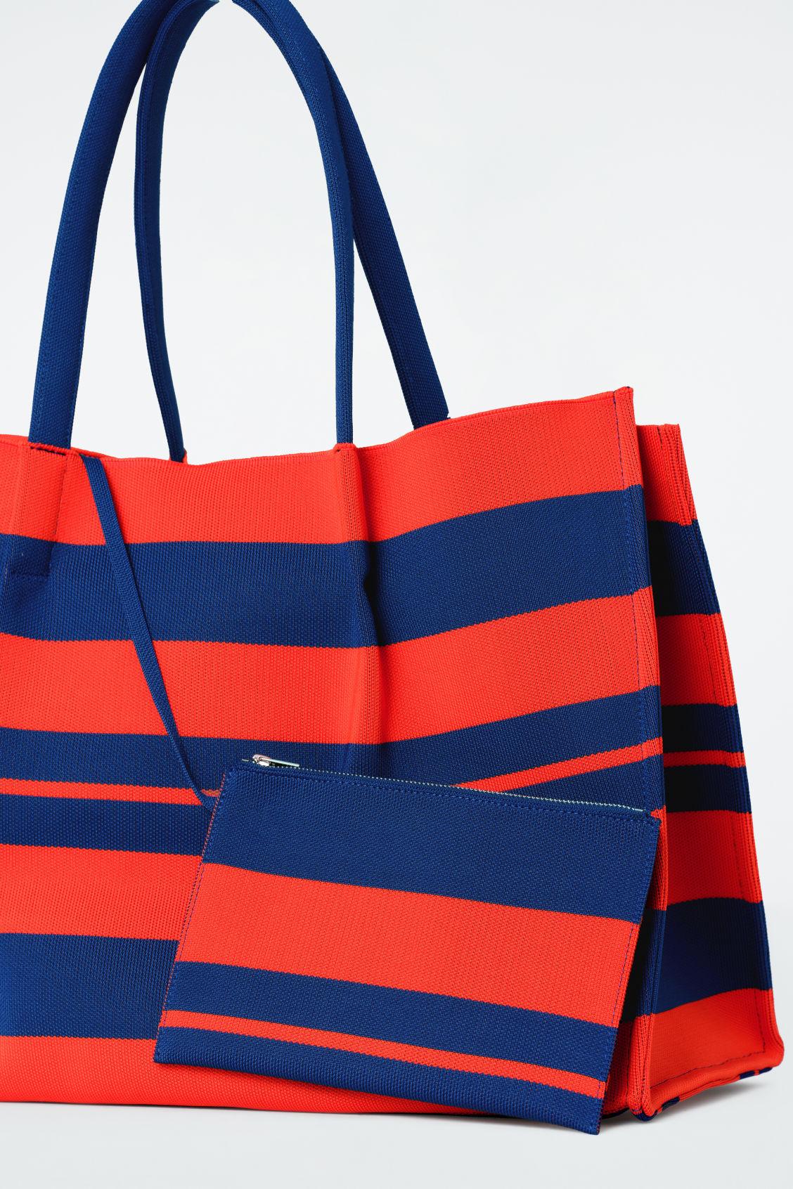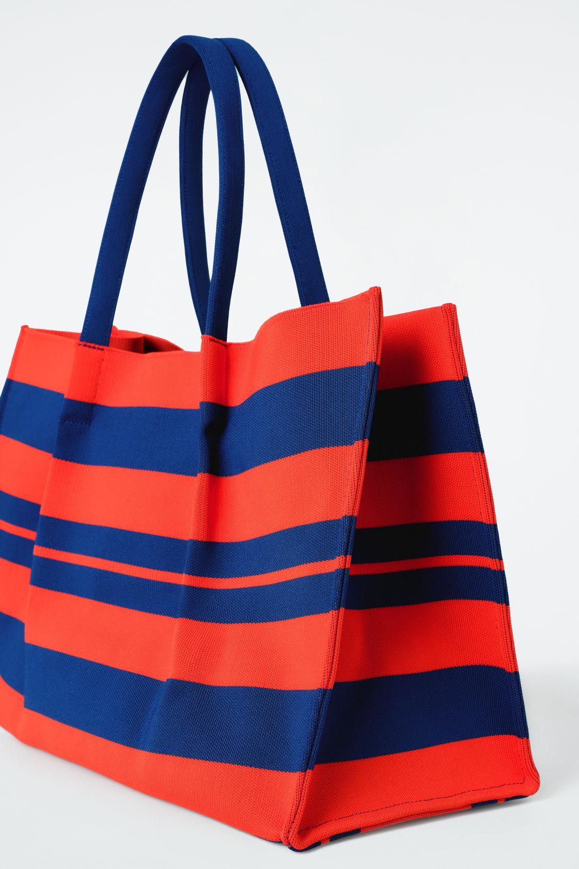 This modern market tote is perfectly sized for sun-drenched getaways and city weekends alike. Striped in royal blue and papaya hues, it features a spacious main compartment to hold your beach towel and a zip-up wallet that keeps valuables close to hand. A better alternative to conventional polyester, recycled polyester is made from pre‐ and post‐consumer waste Shell: 100% Recycled polyester. Excluding trims Height: 35cm, Width: 48cm, Depth: 23cm