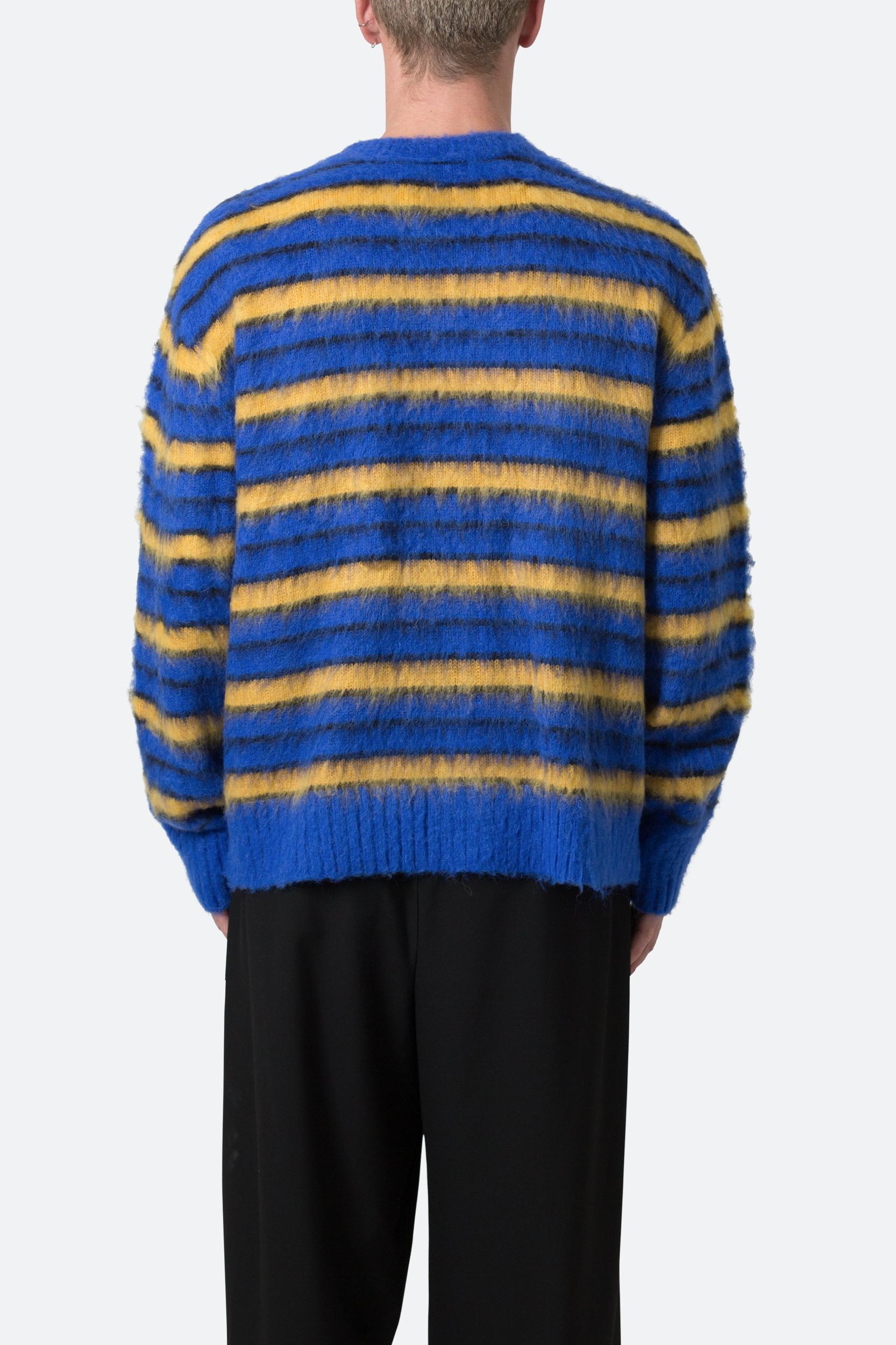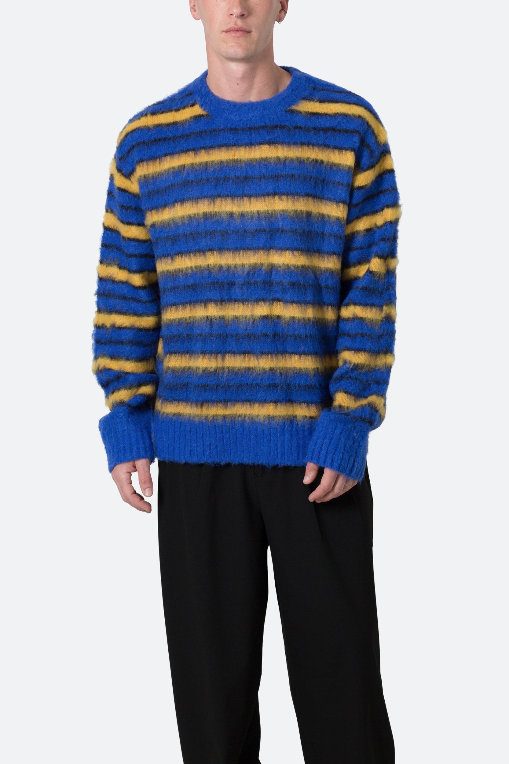 the Striped Mohair Sweater is a custom striped knit sweater that is constructed from a synthetic yarn and features a standard fit, and is finished in a brushed exterior texture. details classic fit 100% polyester model is 6’1, 140 lbs and wears a size medium washing instructions: due to the fabric content on this style