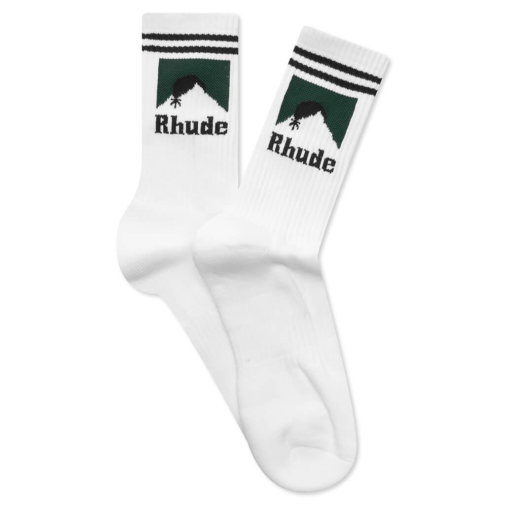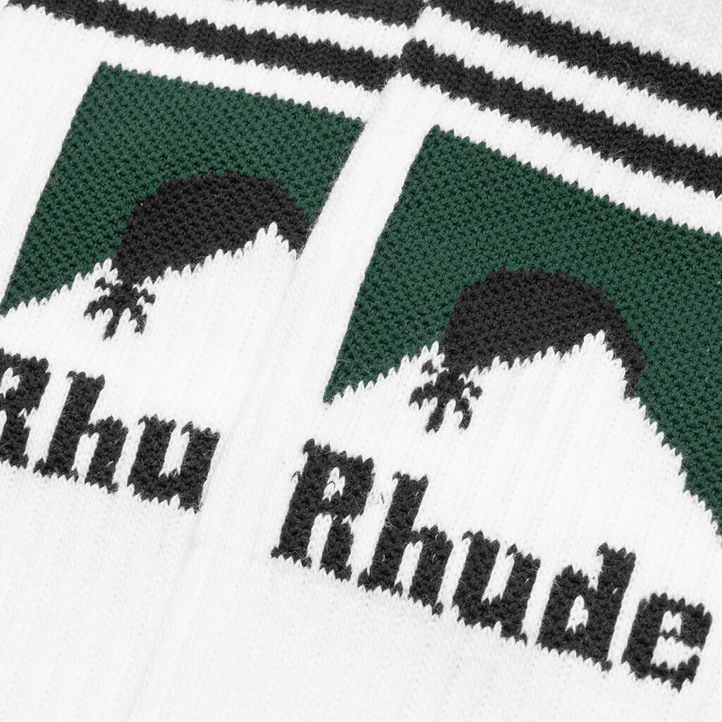 The Rhude Striped Moonlight Sock utilizes a stretch cotton blend for a comfortable, contoured fit. The crew-length design showcases ribbed vertical knitting, finished with stripe accents and a signature brand logo. 80% cotton 12% polyester 8% spandex Ribbed crew length Brand logo and stripe detailing One size fits all Style No: RHPS25SO041173012 PS25SO041173012