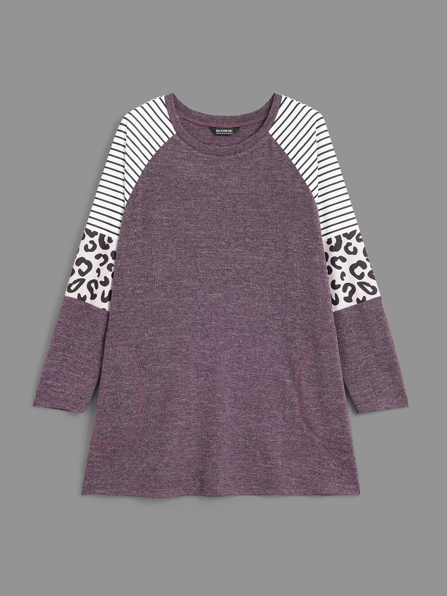 Shop Striped Patchwork Leopard Pocket T-shirt now and redefine your style with confidence at BloomChic. Tailored for mid and plus-size women. This trendy Tops Women, sizes 10-30. Season:Winter;Color:Eggplant;Style:Casual;Prints:Geometric & color block;Neckline:Round Neck;Sleeve Type:Raglan sleeve;Details:Patchwork, Contrast;Pocket:Side seam pocket