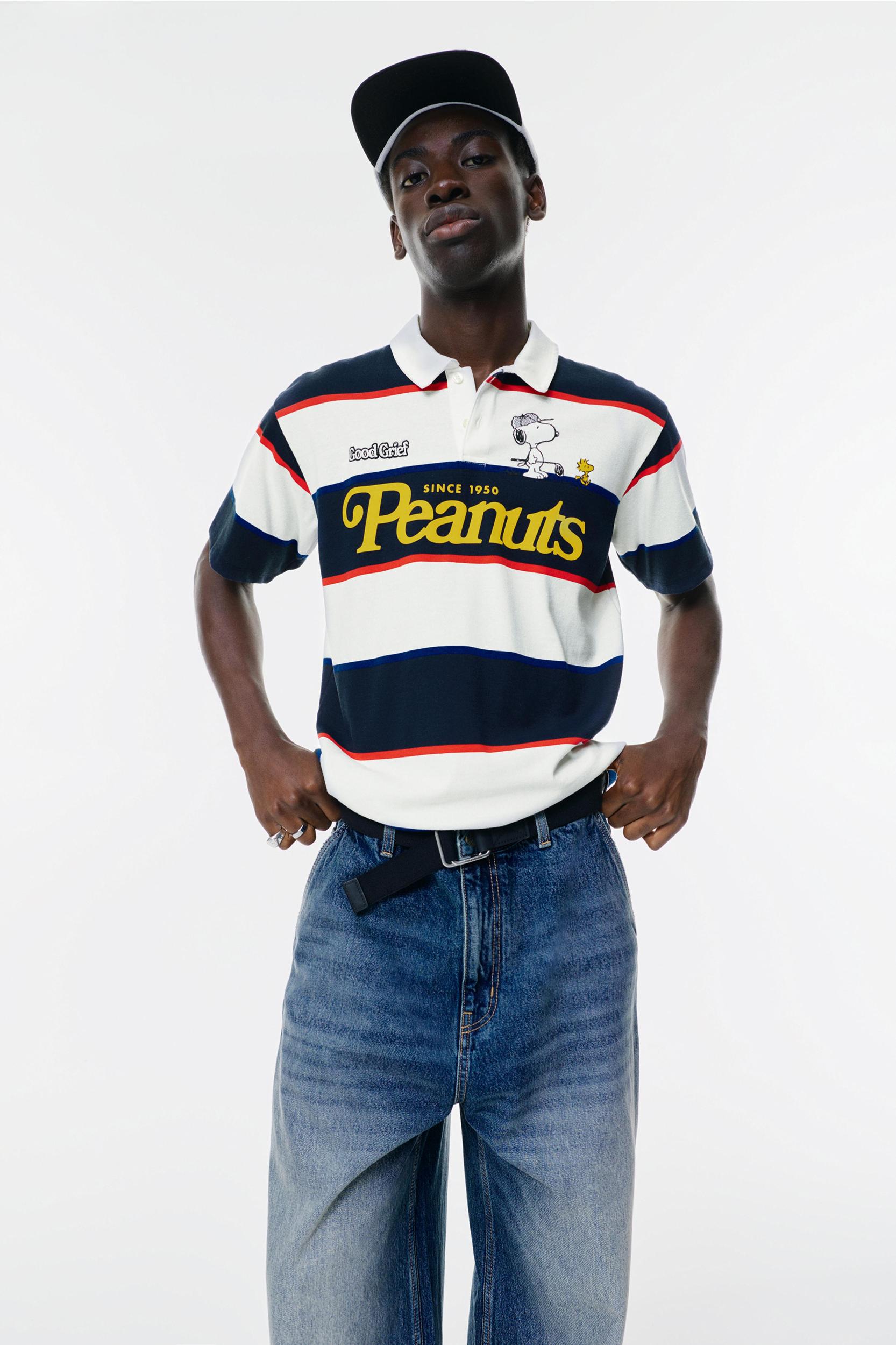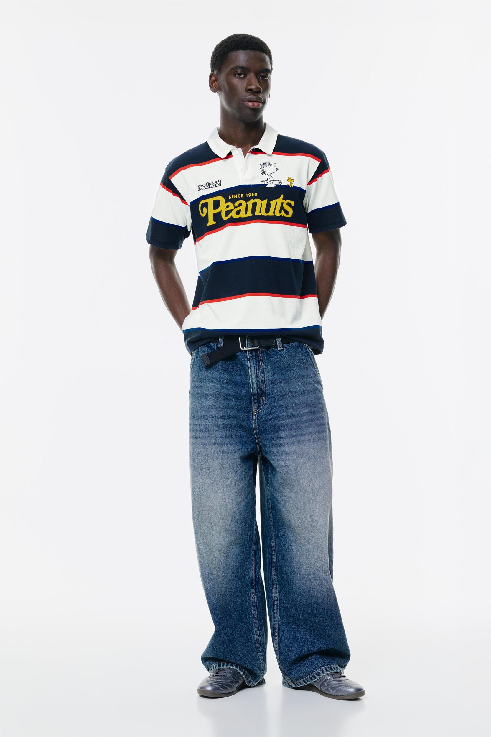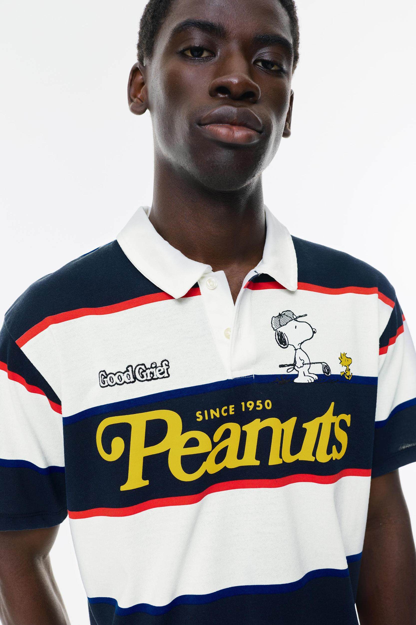 Snoopy licensed polo shirt with a striped design, short sleeves, a contrasting Peanuts graphic, and made from a cotton blend.