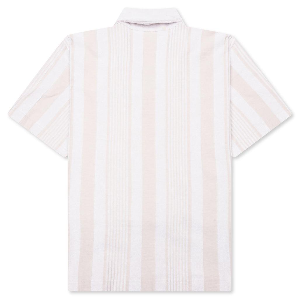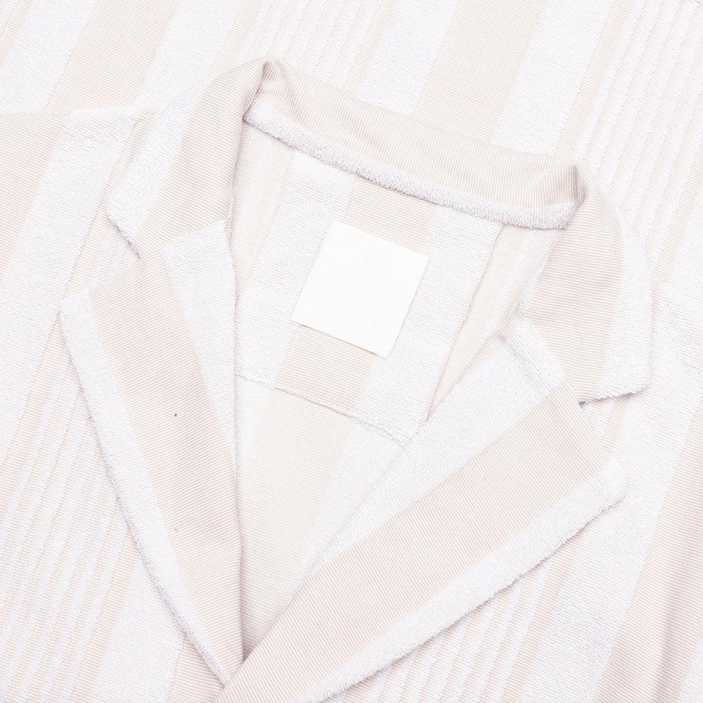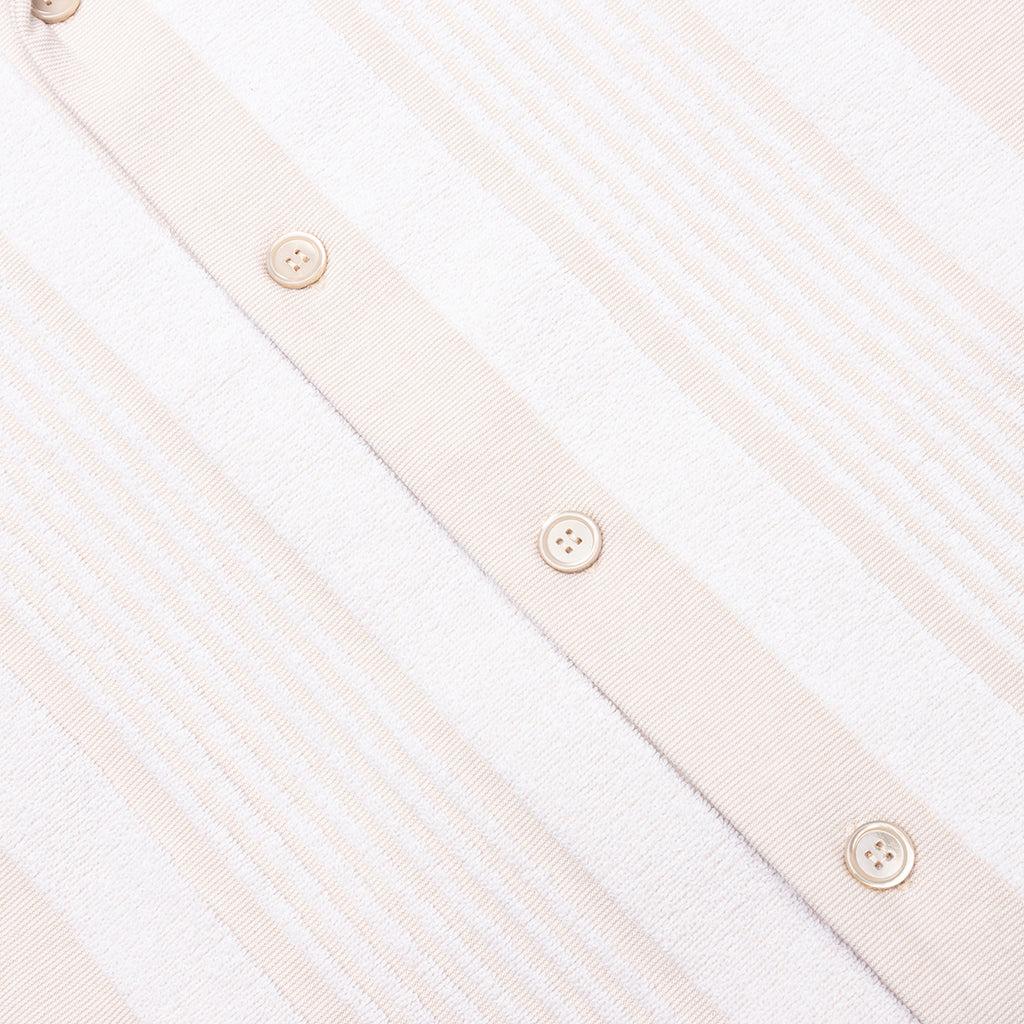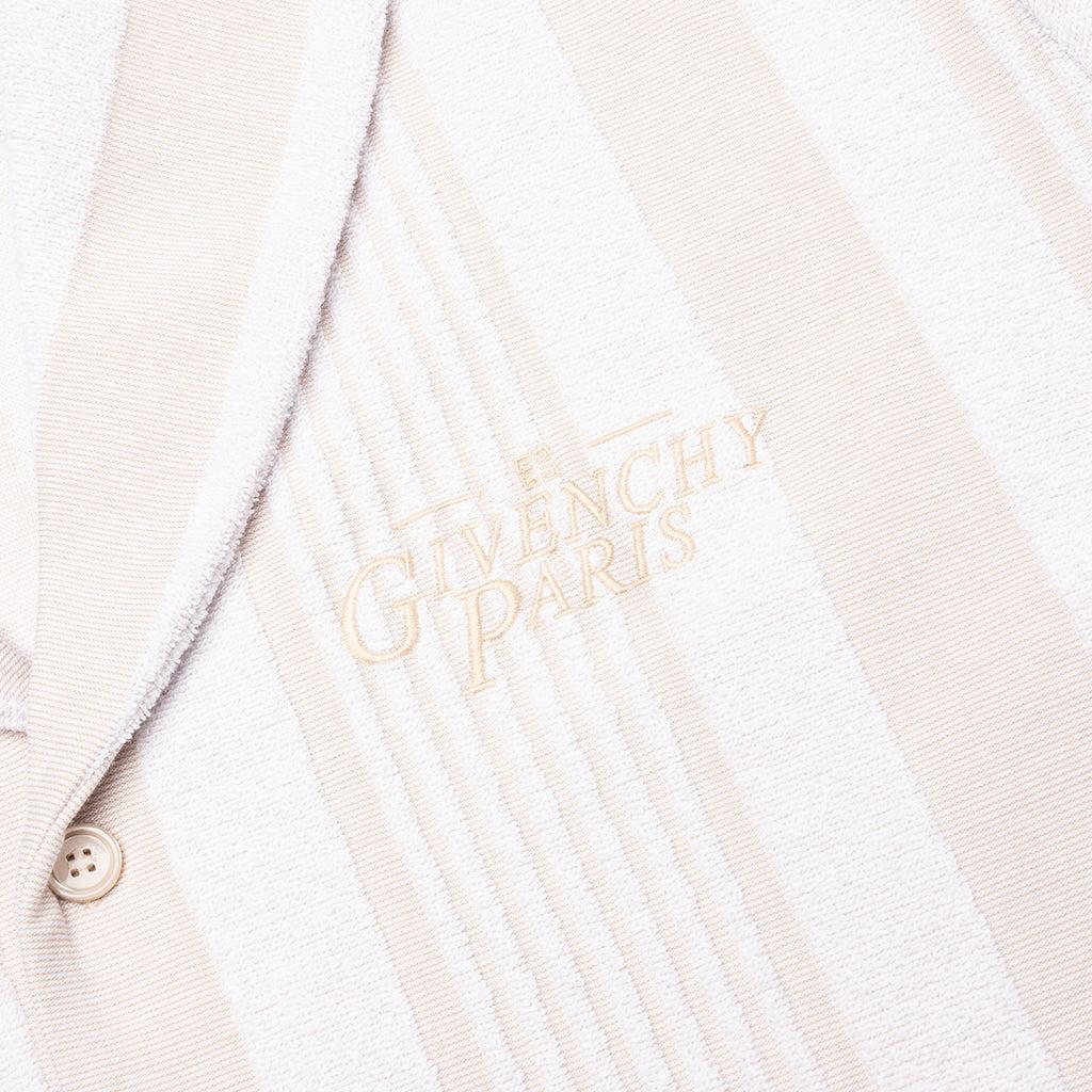 The Boxy Fit Shirt in Cotton Towelling with Stripes in White/Beige offers a relaxed yet elevated look. Crafted from jacquard cotton towelling, this short-sleeved shirt features a laid-back Hawaiian collar and a subtle striped pattern. The small GIVENCHY Paris signature is embroidered on the chest, adding a refined detail. With a button closure and boxy fit, this piece is perfect for casual, warm-weather styling. Short-sleeved shirt in jacquard cotton towelling. Hawaiian collar. Striped pattern. Small GIVENCHY Paris signature embroidered on the chest. Button closure. Boxy fit Style No: BM61163162118