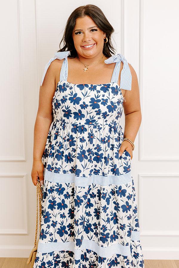 - Twirl into pure sweetness with this darling floral maxi dress! The cute print and playful tied straps will keep you feeling stylish and oh-so-charming all day long. - Lightweight material with a floral print featuring navy and an orange hue - White and sky blue colored striped accent material - A square cut neckline - Straps that tie into bows at the tops of the shoulders - A smocked back - A waistline with an elastic back - Hidden side pockets - A built-in lining that ends at the knee - A flowy silhouette that ends in a straight maxi length hemline