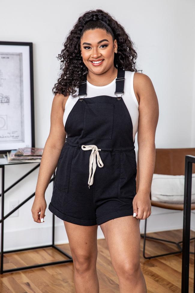Details Black overalls Fabric has some stretch Tie waist with pockets and adjustable straps Pair this romper with a tee and sneakers Unlined Size small from shoulder to hem: (straps fully loosened) 31.5" Material and Care 80% cotton, 20% polyester Hand wash, hang to dry Patterns may vary Materials may have natural variations Colors may vary from different viewing devices.