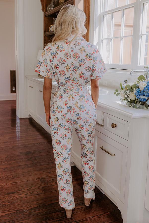 - Exude charm with every step in this beautiful jumpsuit! Its trendy design and sweet floral print make it a stylish piece of effortless fashion. - Unlined denim material with a colorful floral print featuring primrose yellow, sky blue, coral, blooming dahlia, and green hues - A collared v-cut neckline - Short sleeves with rolled cuffs - Functional chest pockets - A buttoned down front ending just below the waistline - Belt loops and a removable tie closure belt - Functional front and back pockets - A relaxed yet flattering silhouette that ends in straight, ankle length hemlines