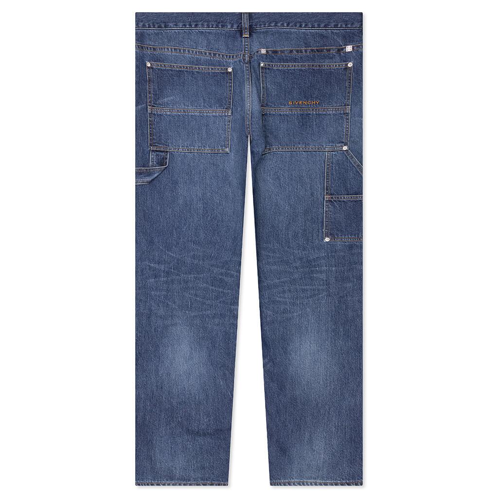 The Givenchy Studded Carpenter Pants in Blue are crafted from 100% cotton and feature classic belt loops and side pockets. These workwear-inspired pants are distinguished by their studded detailing. 100% Cotton Belt loops Side pockets Workwear-inspired Studded detailing Style no: BM51CR5Y9E-400