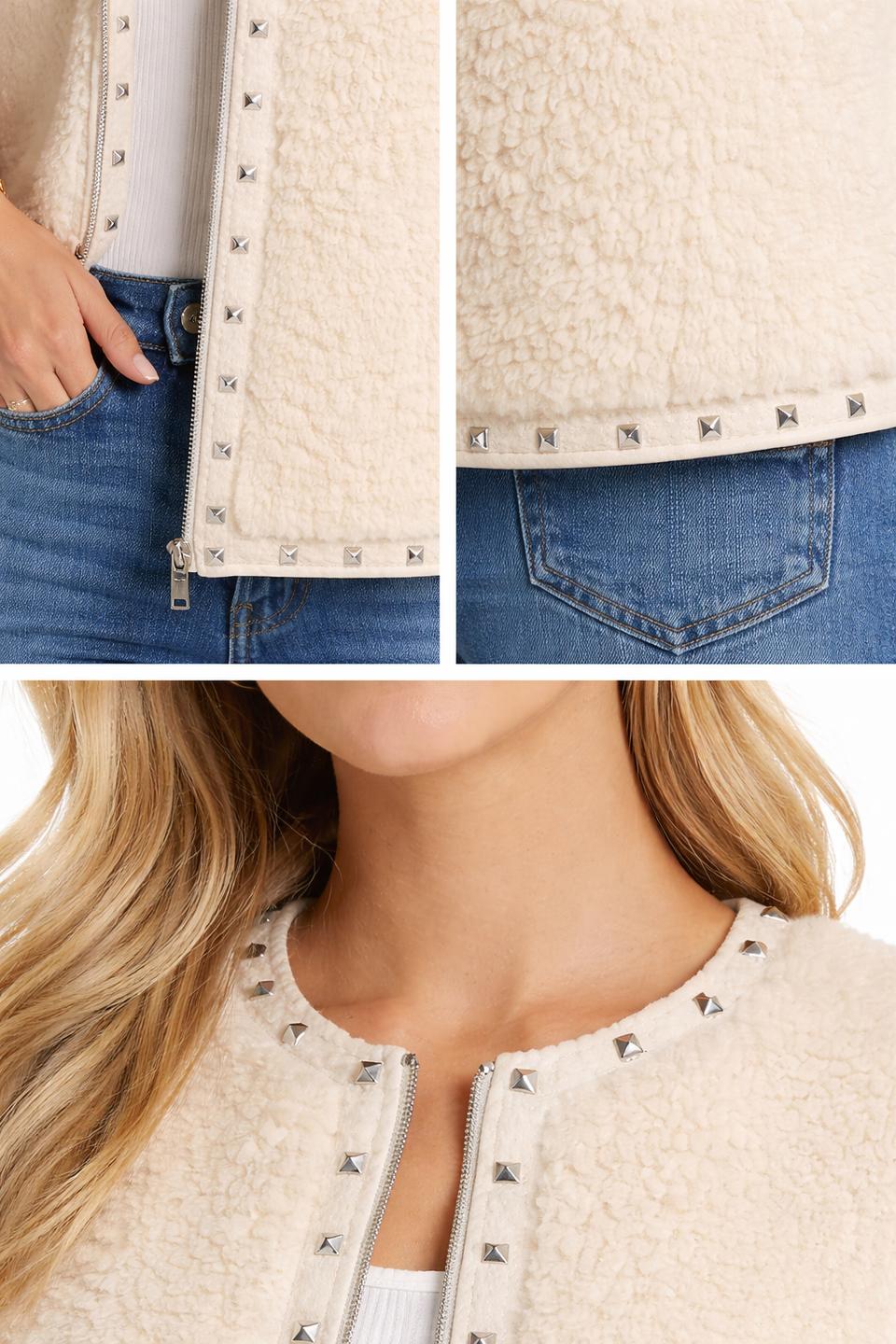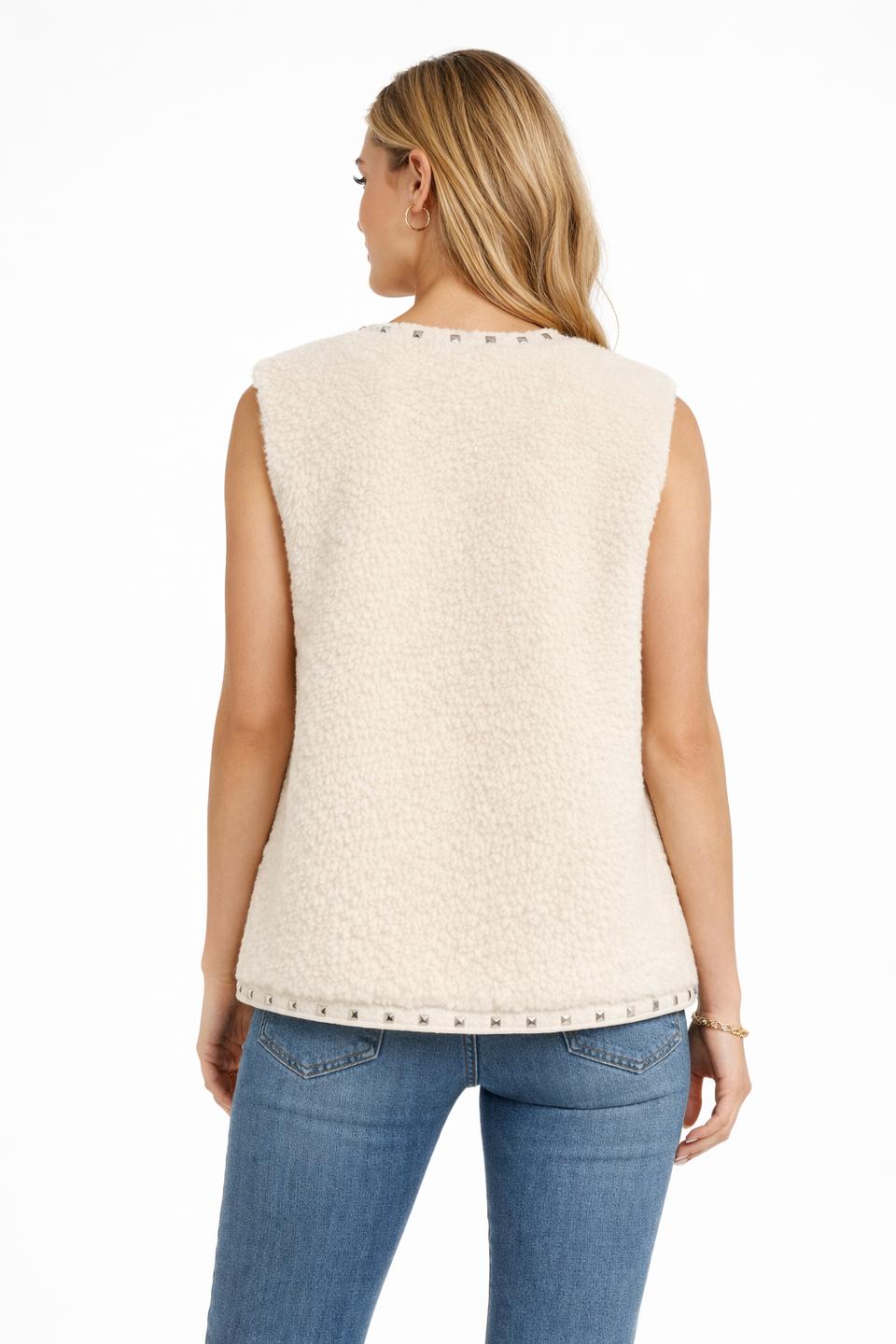 Crafted from plush ivory lamb wool, this sleeveless vest combines cozy texture with modern edge. Designed with a clean round collar and finished with signature stud detailing, it layers effortlessly over casual or elevated looks.