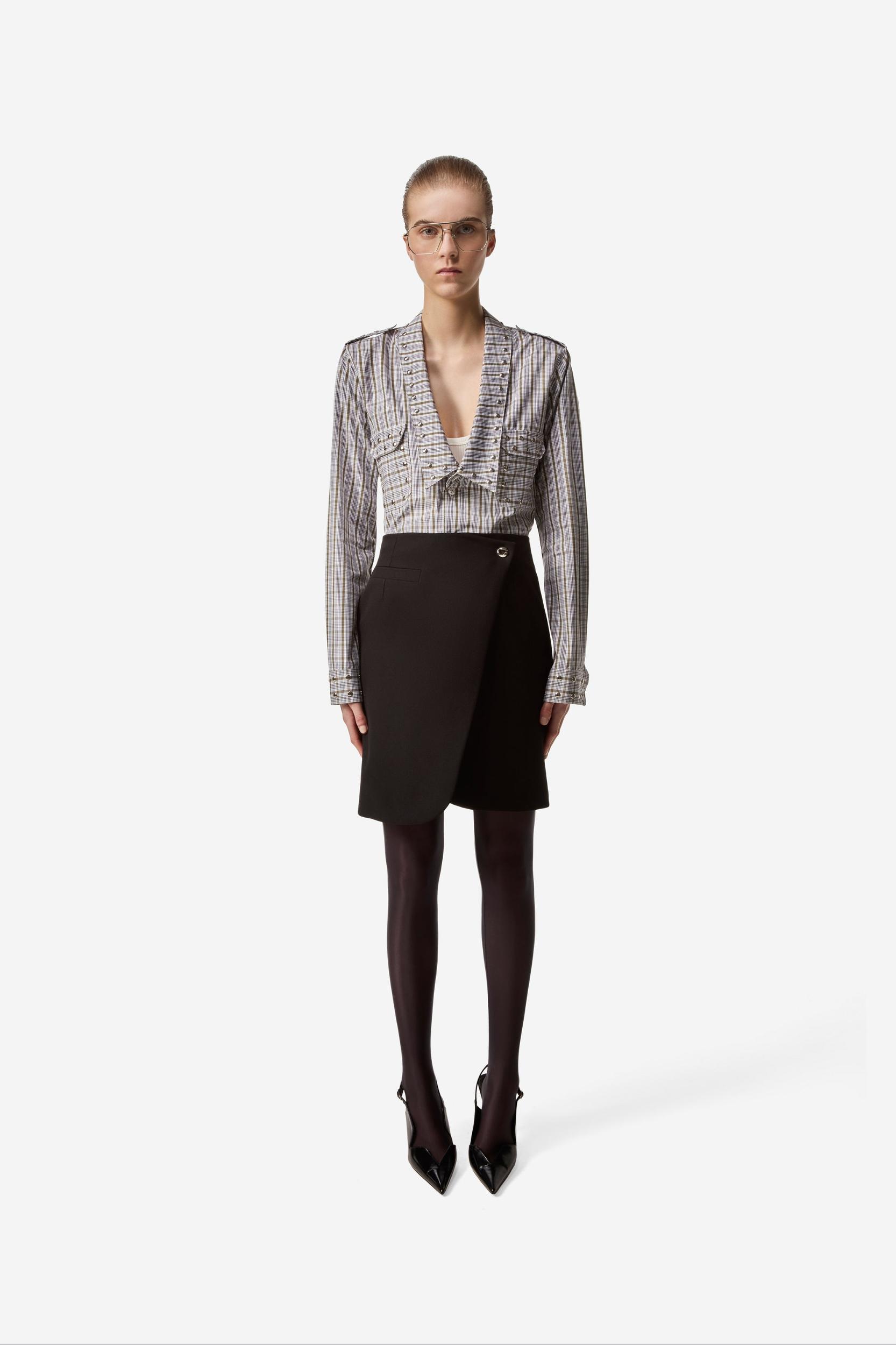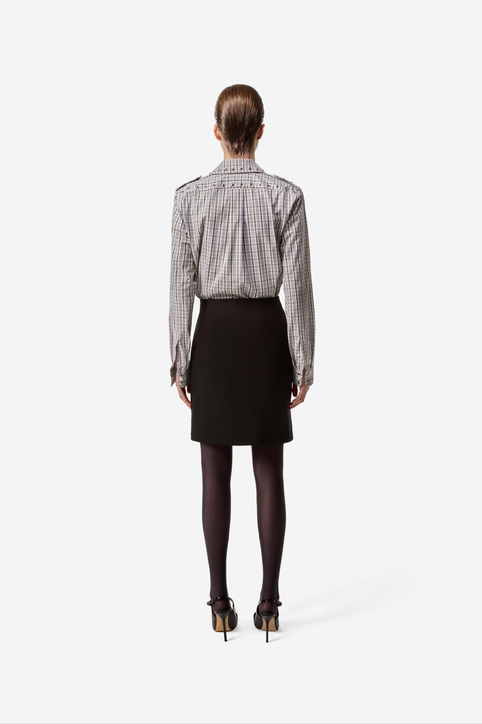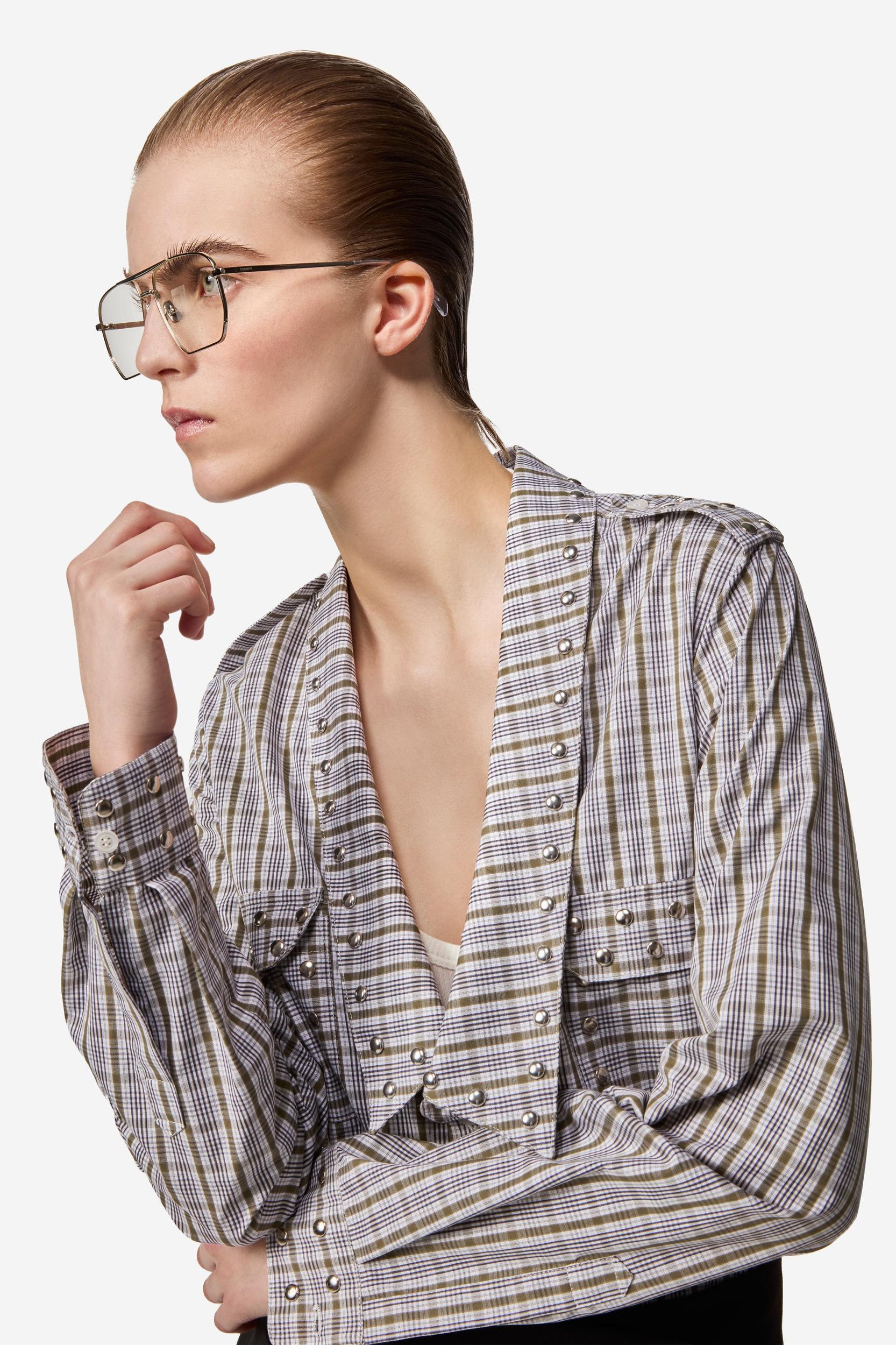 The Saharan shirt has a slim fit with a long deep collar for a low V-neckline. Crafted from lightweight cotton in a green and white check, it features shoulder epaulettes for a utilitarian touch. The shirt is peppered with small silver studs on the cuffs, collar and two front pockets. .