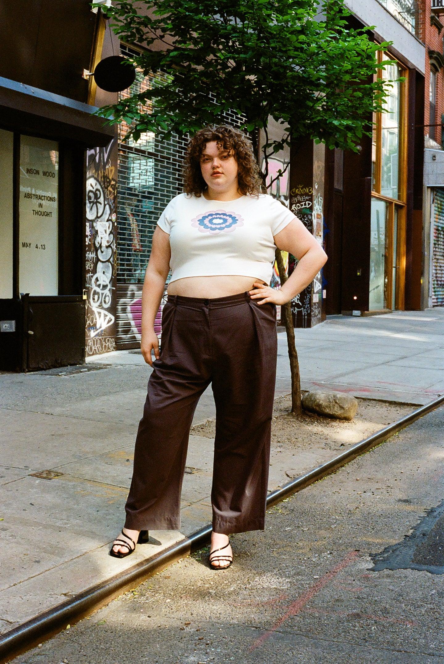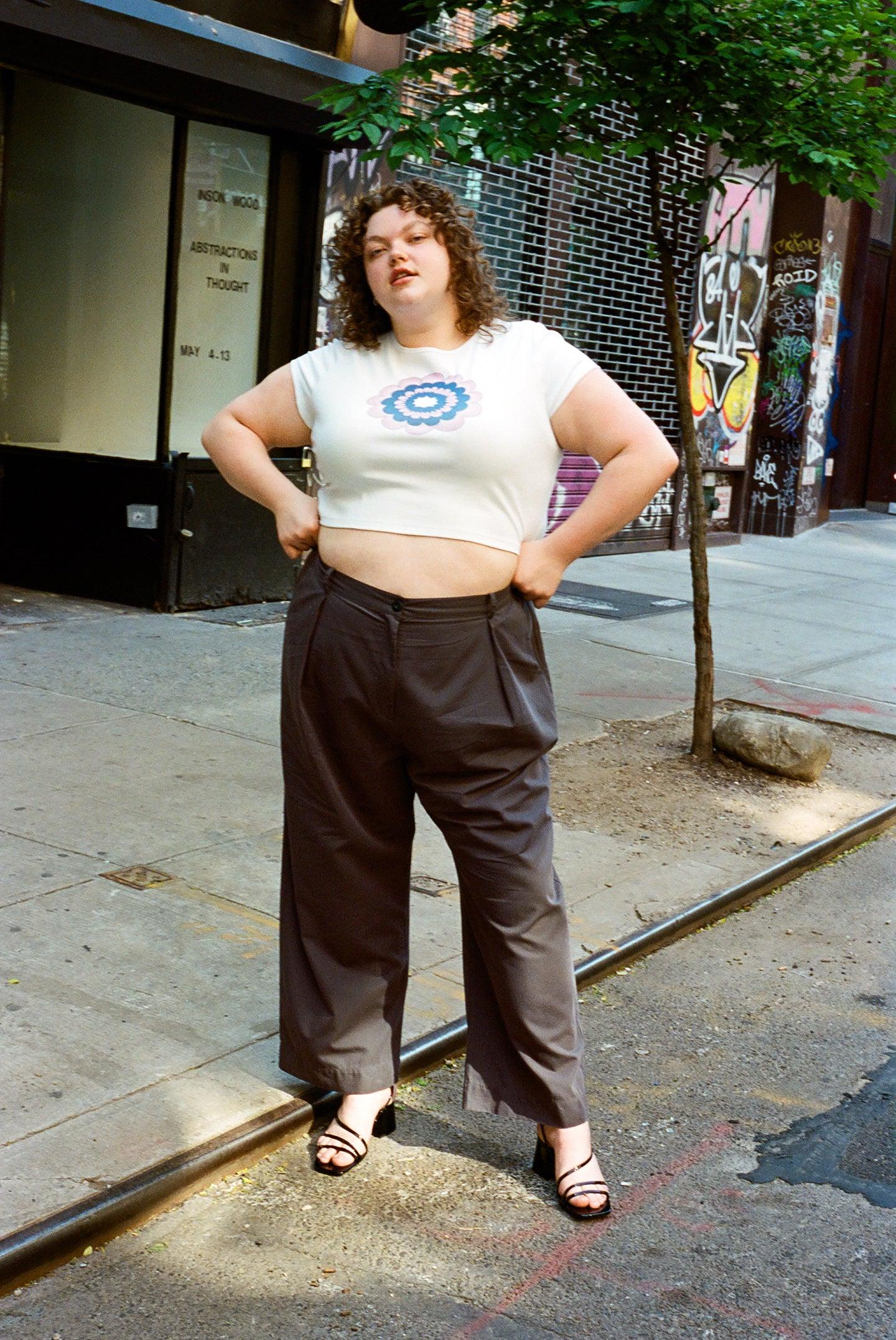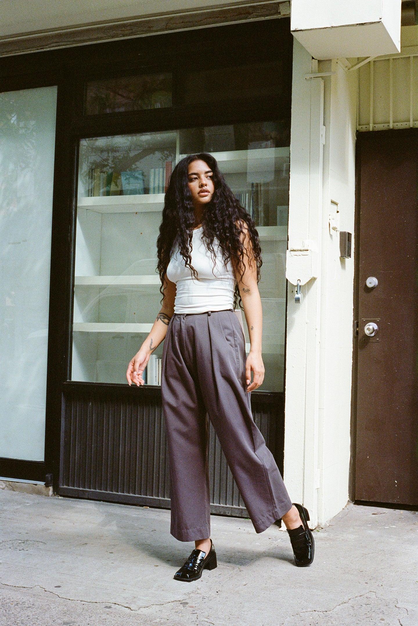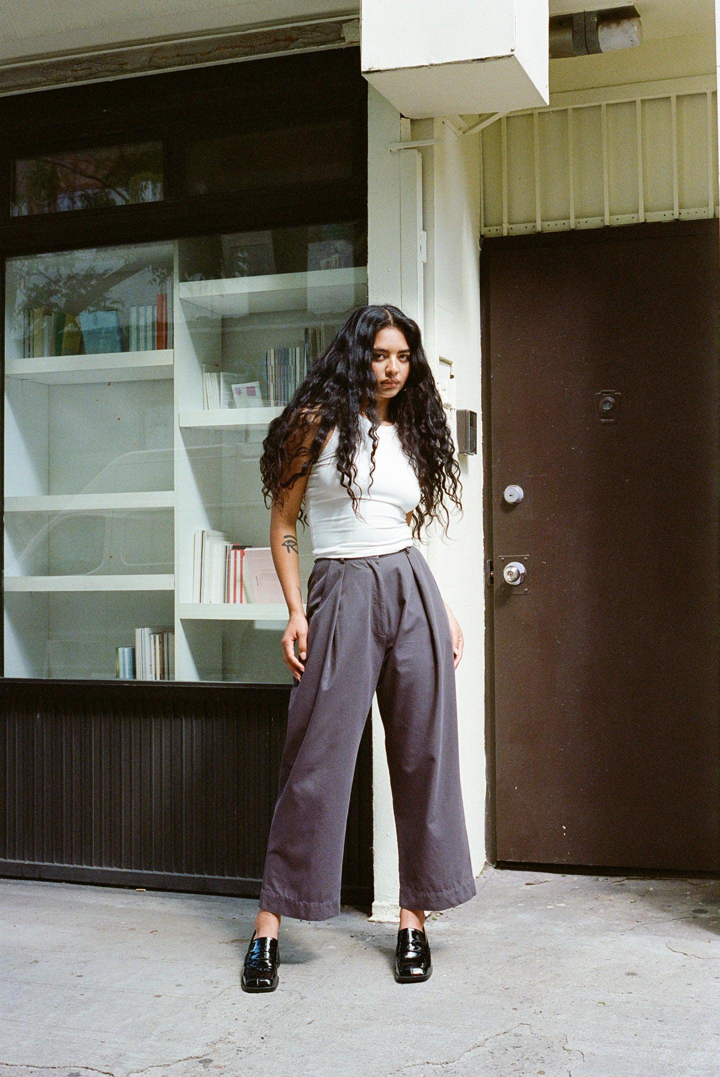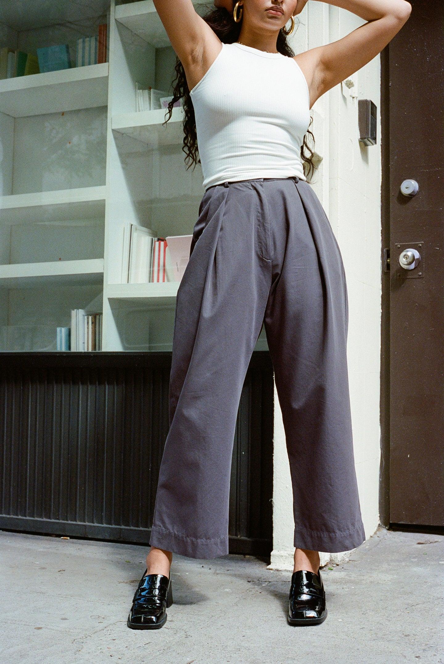 Vintage inspired trousers with the best movement and flow. Slightly tapered at the hemline with a relaxed leg. Featuring a high pleated front waistline. Super soft midweight cotton tencel blend in faded black for a lived in look. Fitted trousers. Size up for a more relaxed look.Faith is wearing a size 4. Faith is 5’10 with a 33” bust, 26” waist, and 37” hip.Charlie is wearing a size 22. Charlie is 5’10 with a 55” bust, 47” waist, and 53” hip.Jade is wearing a size 22. Jade is 5’9 with a 44” bust, 47” waist, and 59” hip.50% Cotton, 50% TencelMachine wash cold, gentle cycle. Do not bleach. Cool iron when needed. Do not tumble dry. Air dry.Made, fair trade, in Hong Kong; Designed and developed in NYC.