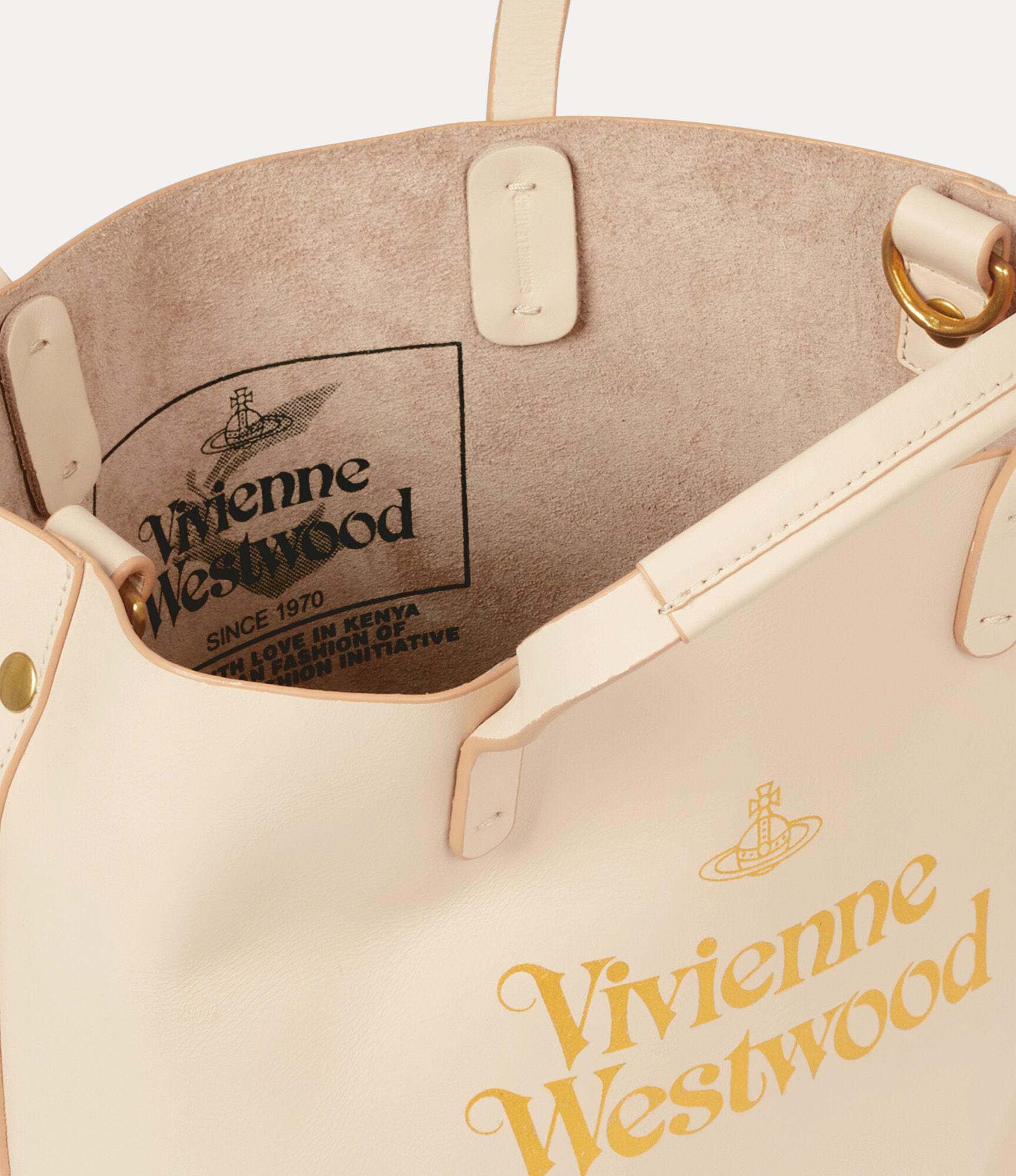 The Studio Small shopper from the Vivienne Westwood Made in Kenya collection offers a small, pink leather silhouette, adorned with a raw, unlined interior. The piece features the house’s signature gold-tone foil lettering embossing on the front panel of the design, inspired by the shopping bags distributed in the boutiques from our Red Label era.