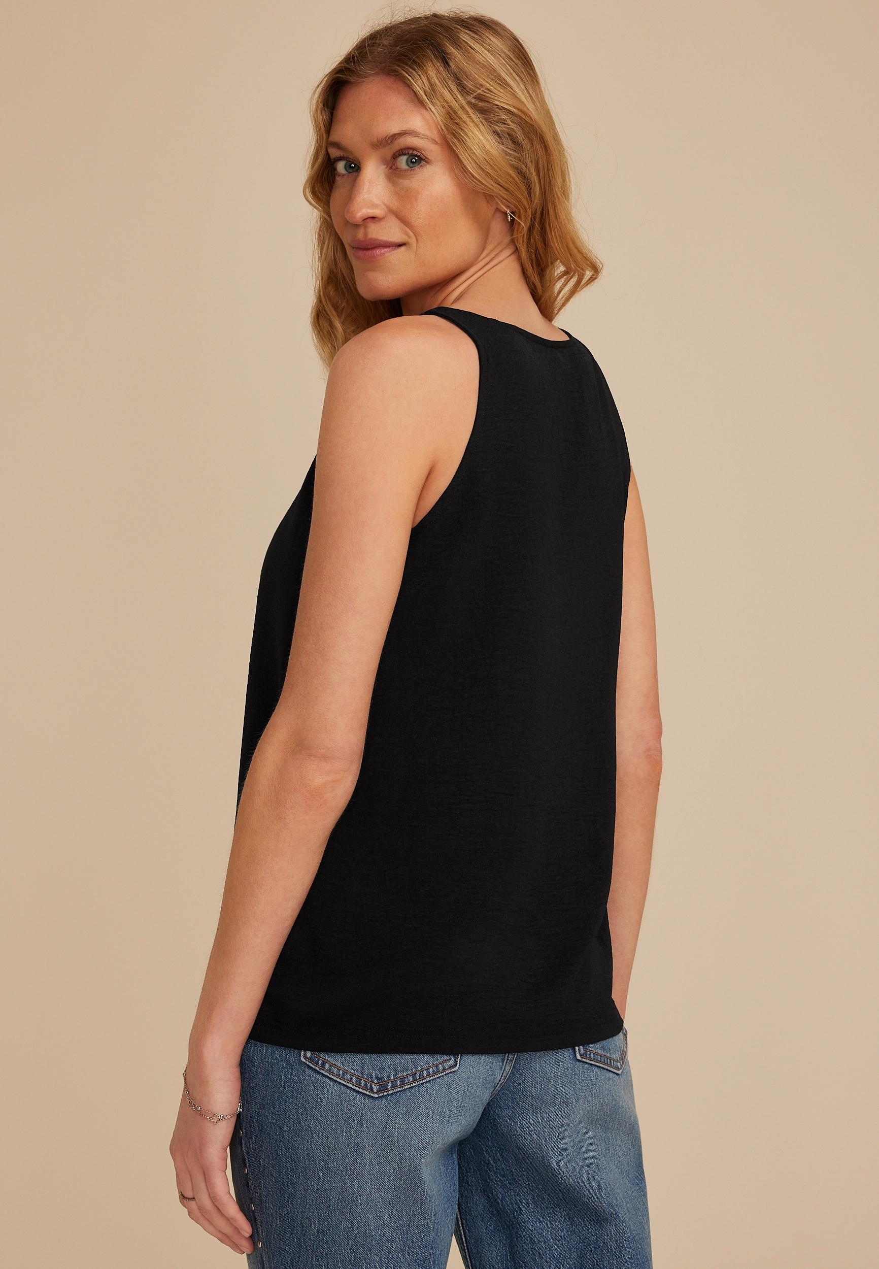 The Studio Y Lattice Neck Tank Top features a bold double-strap neckline and a relaxed fit that’s made to move with you. Whether layered with your favorite blazer, jacket, or cardigan or worn solo it’s your go to for a polished everyday style. It's designed for versatility and comfort, this tank transitions effortlessly from work to weekend. .mar-pdp-section .mar-product-description {color: #000;}.mar-pdp-section .mar-product-description ul, .mar-pdp-section .mar-product-description ul>li {margin-left: 10px;padding-left: 10px;}.mar-pdp-section .mar-product-description .mar-product-description-content ul li{list-style-type: disc;margin: 0 0 5px;padding-left: 5px;}.mar-pdp-section .mar-product-description p {color: #000;padding: 5px 0;}@media only screen and (max-width: 1023px){.mar-pdp-section .mar-product-description .mar-product-description-content ul li{list-style-type: disc !important;} .mar-pdp-section .mar-product-description .mar-product-description-content .mar-tab-content ul{padding-left: 10px;}.mar-pdp-section .mar-product-description .mar-product-description-content .mar-tab-content {font-weight: 300;}} Features: lightweight crinkle textured fabric solid versatile color v neck with double strap details bra coverage sleeveless shirttail hem