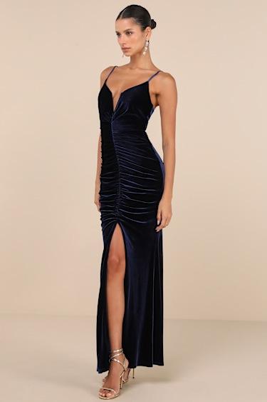 Your RSVP will always be in demand when you're wearing the Lulus Stunning Invitation Navy Velvet Ruched Sleeveless Maxi Dress! Plush, stretchy velvet shapes this chic dress that has adjustable spaghetti straps and a fitted bodice with a plunging V-neckline (and internal V-bar support). Ultra-flattering ruching runs down the center of the bodice, finishing at a sexy front slit that falls to a maxi hem. Hidden zipper/clasp at back.