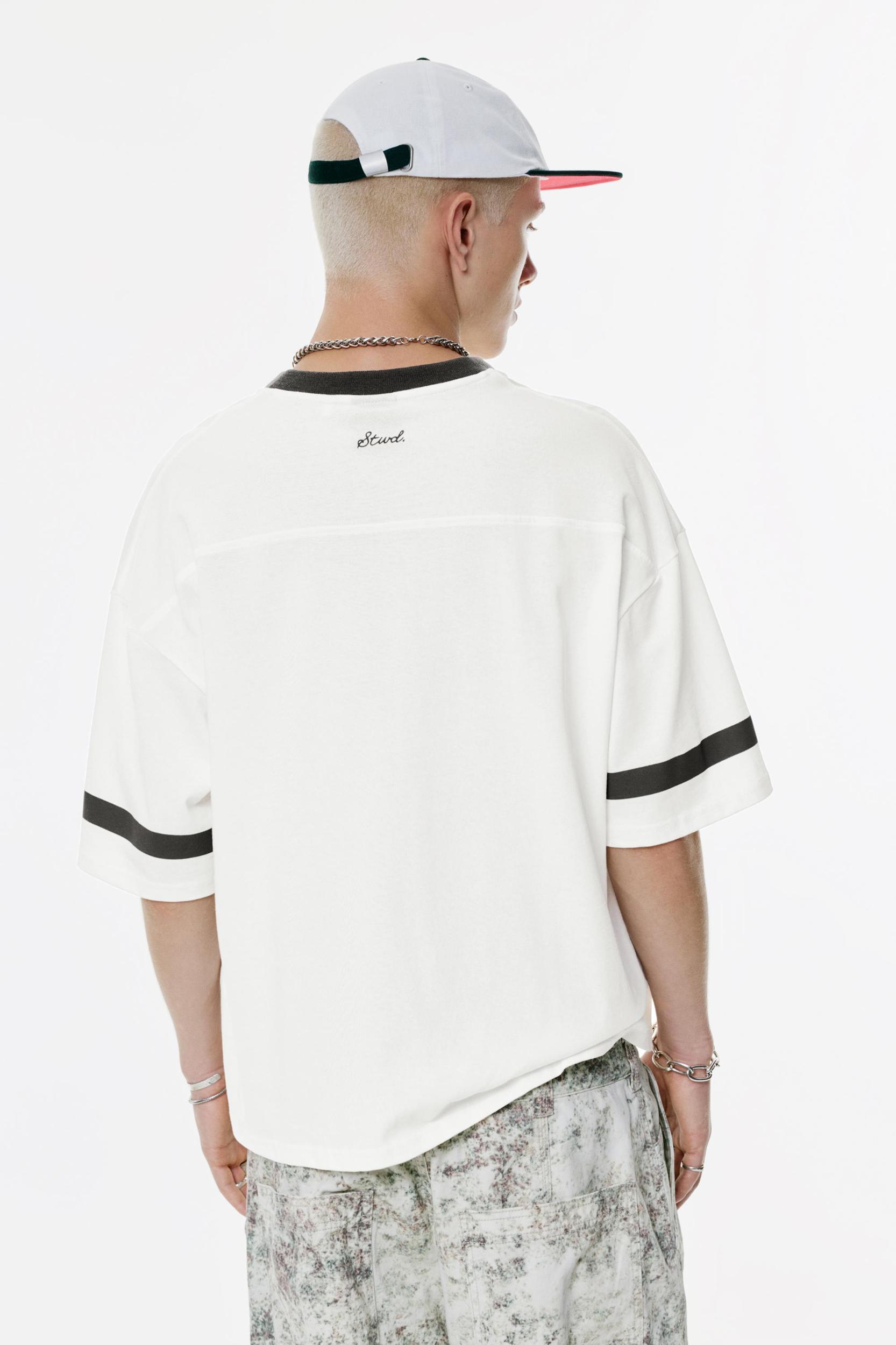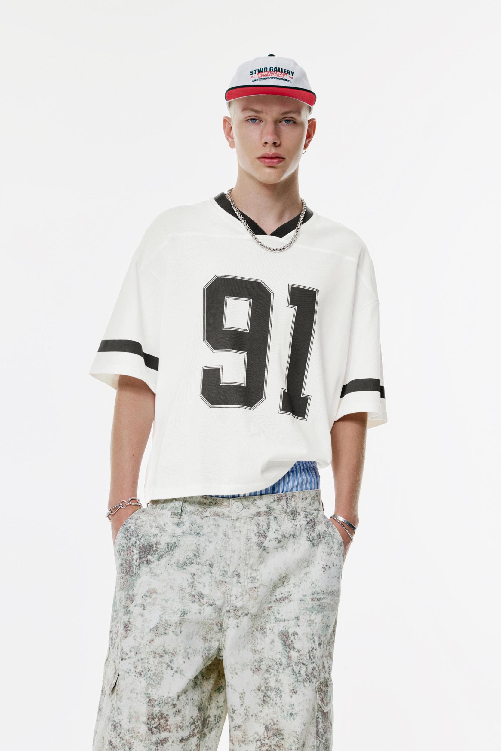 Short sleeve boxy-fit hockey T-shirt with a V-neck and a number 91 graphic on the front. Made of cotton.