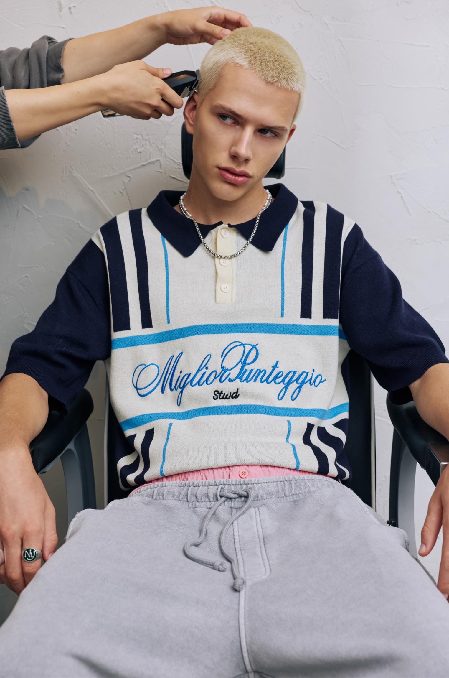 STWD sporty short sleeve knit polo shirt with striped detail and ‘Miglio Punteggio’ embroidery.