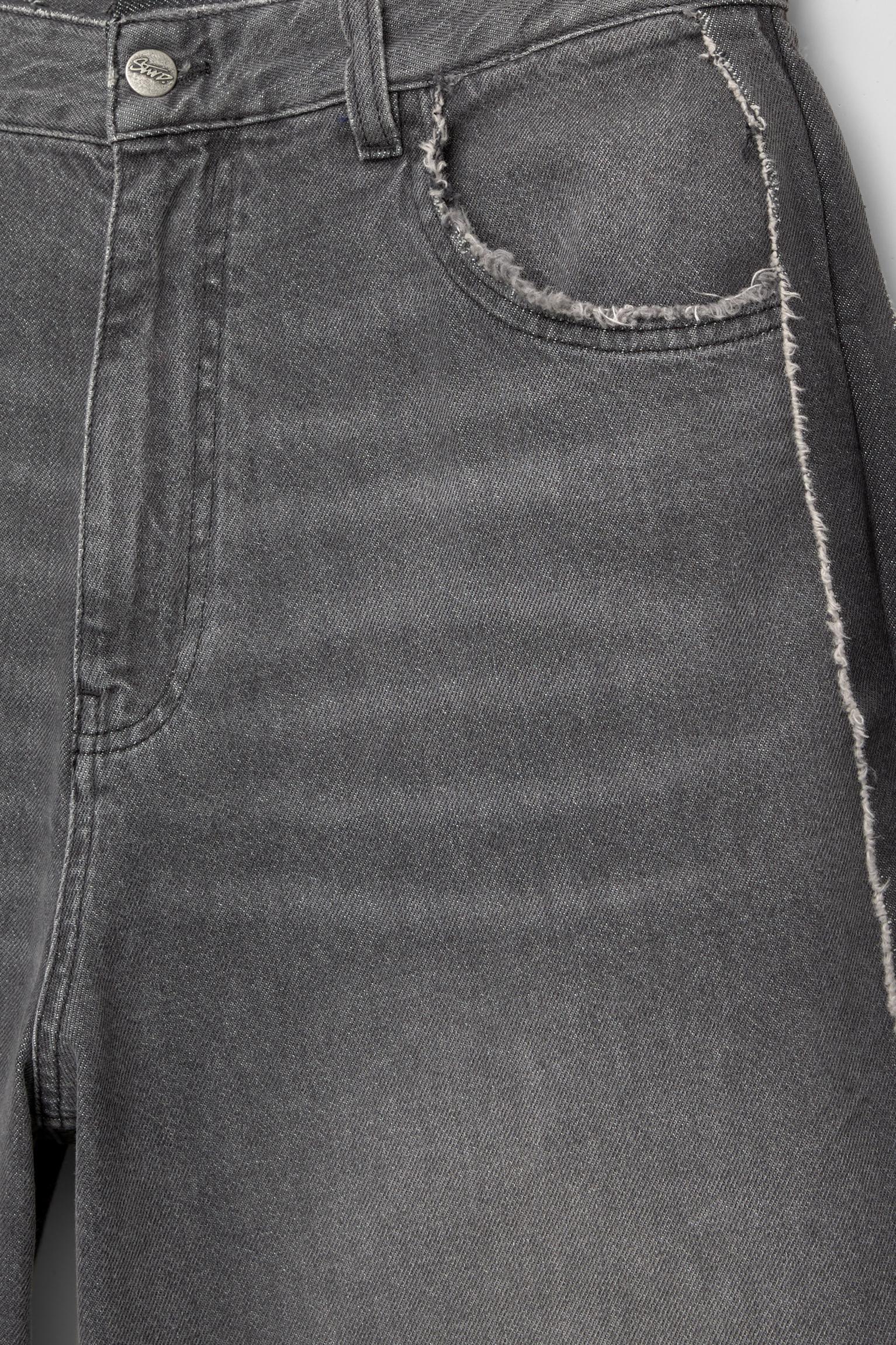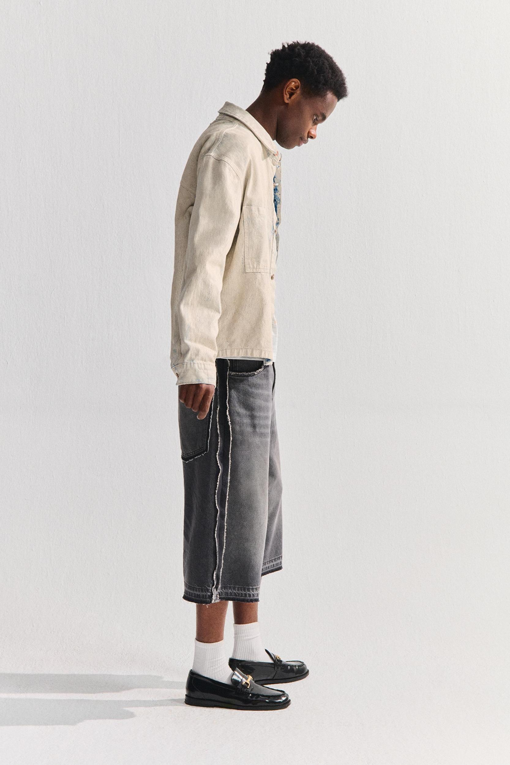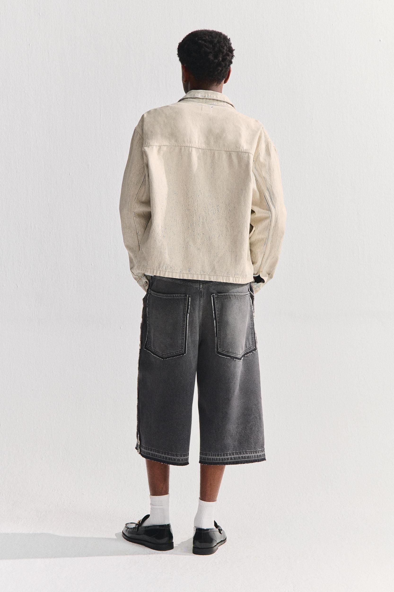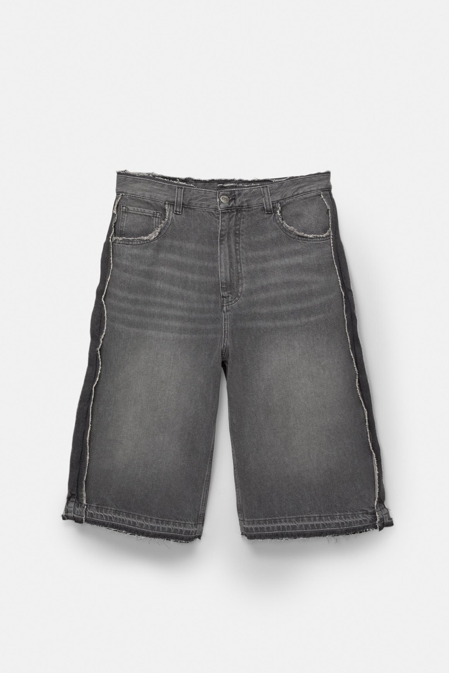 Super baggy denim Bermuda shorts with piping, a five-pocket design, belt loops, and zipper fly and top button fastening. Made of cotton.