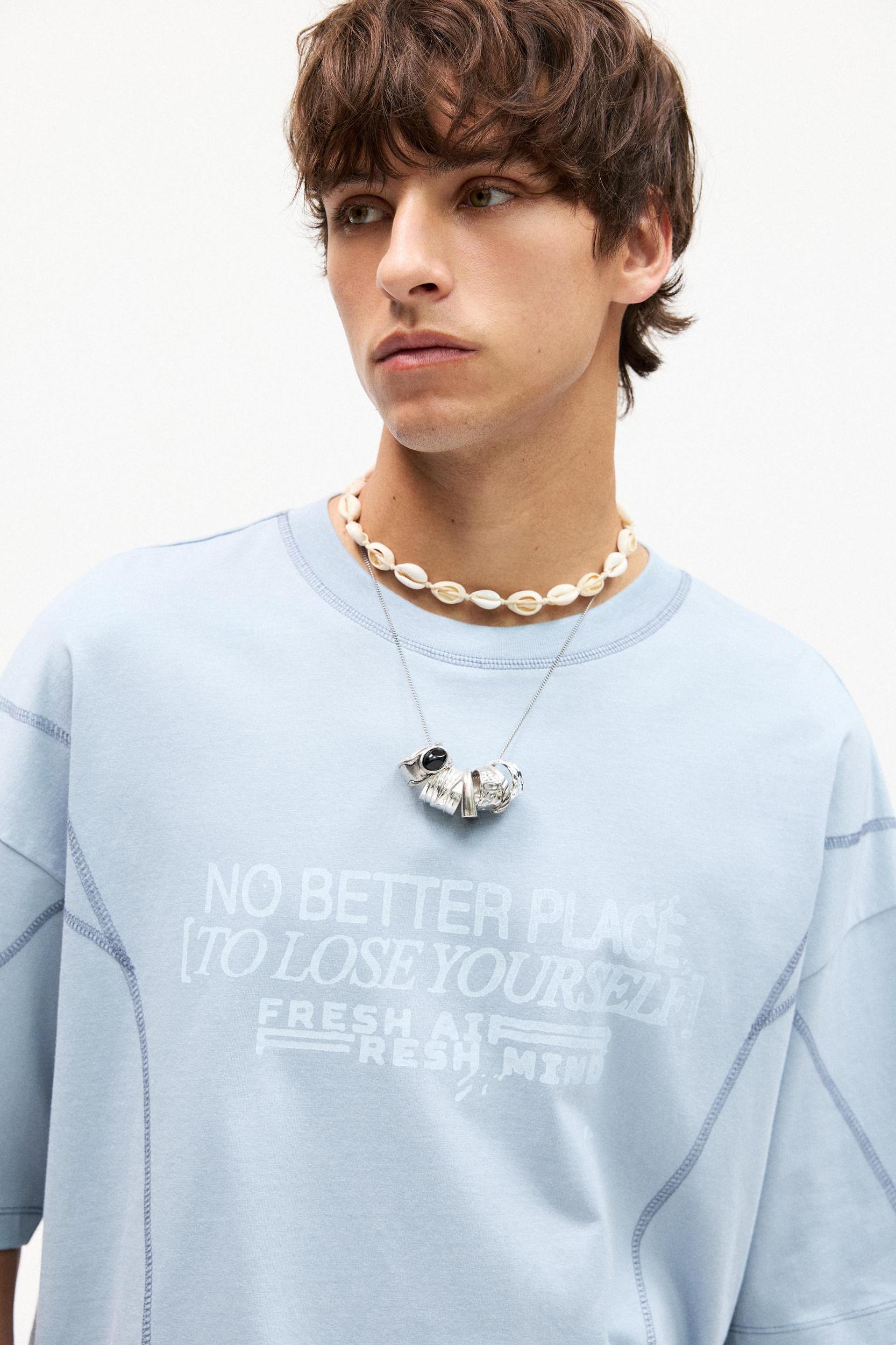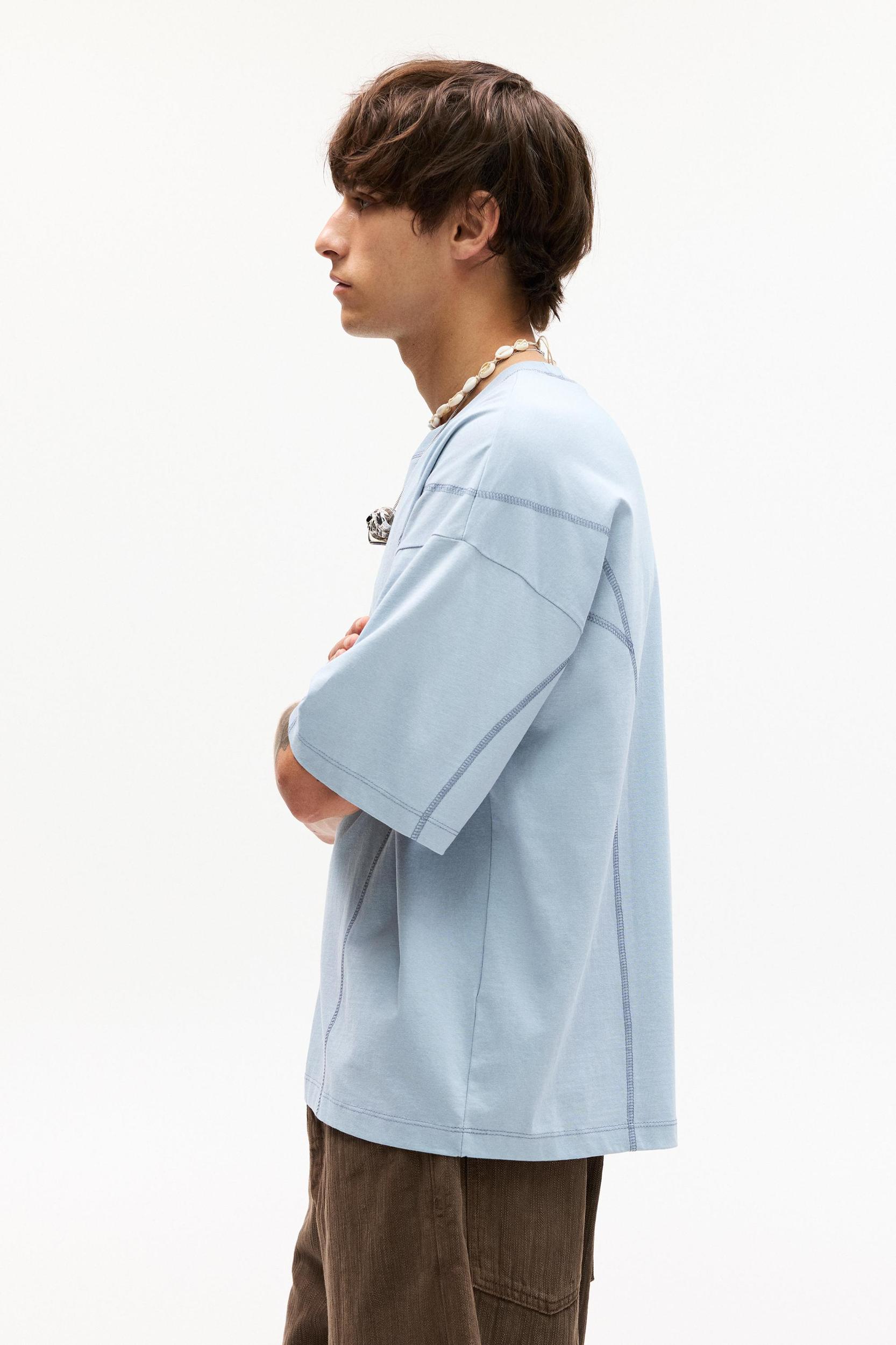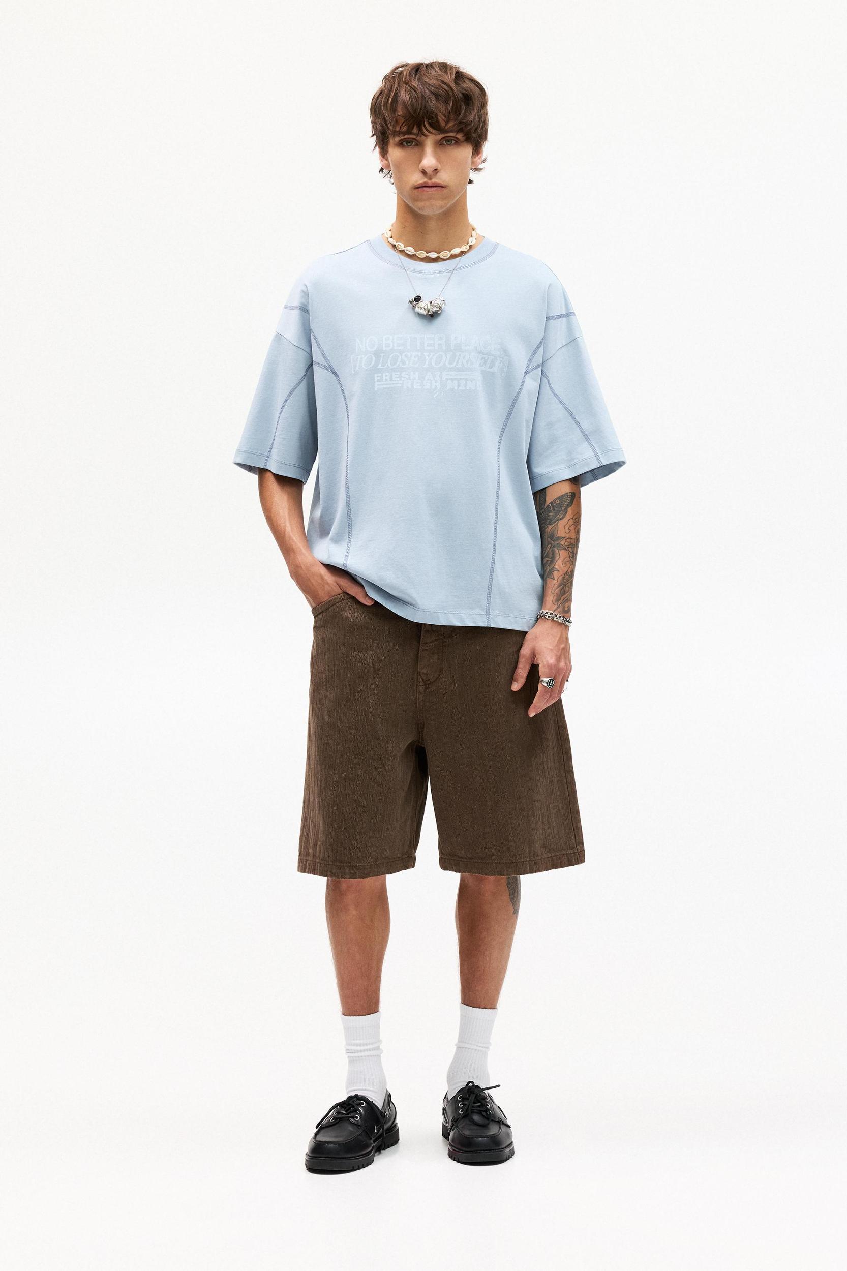 Blue short sleeve T-shirt featuring contrast seams and slogan, and a crew neck. Made of cotton.