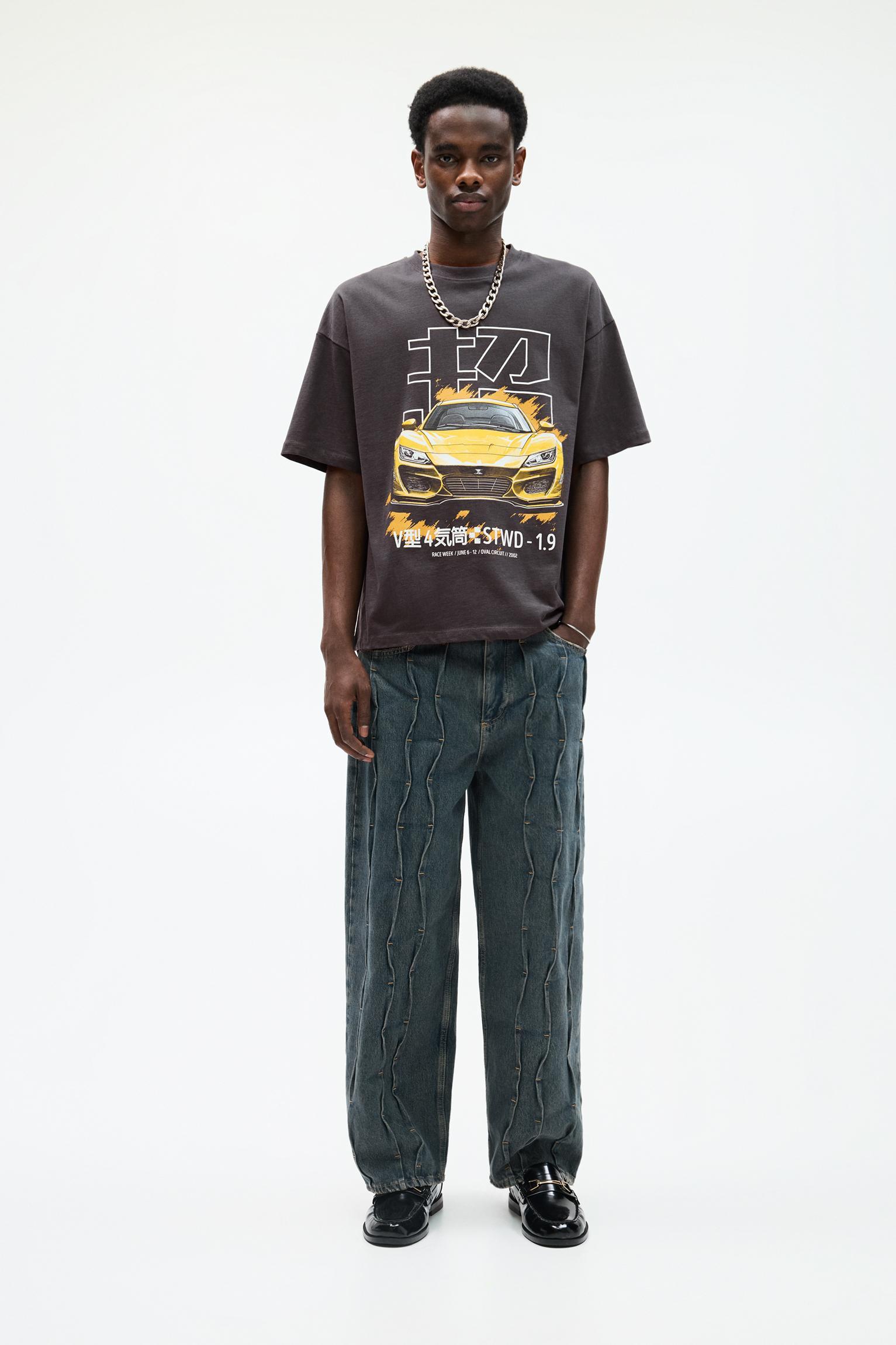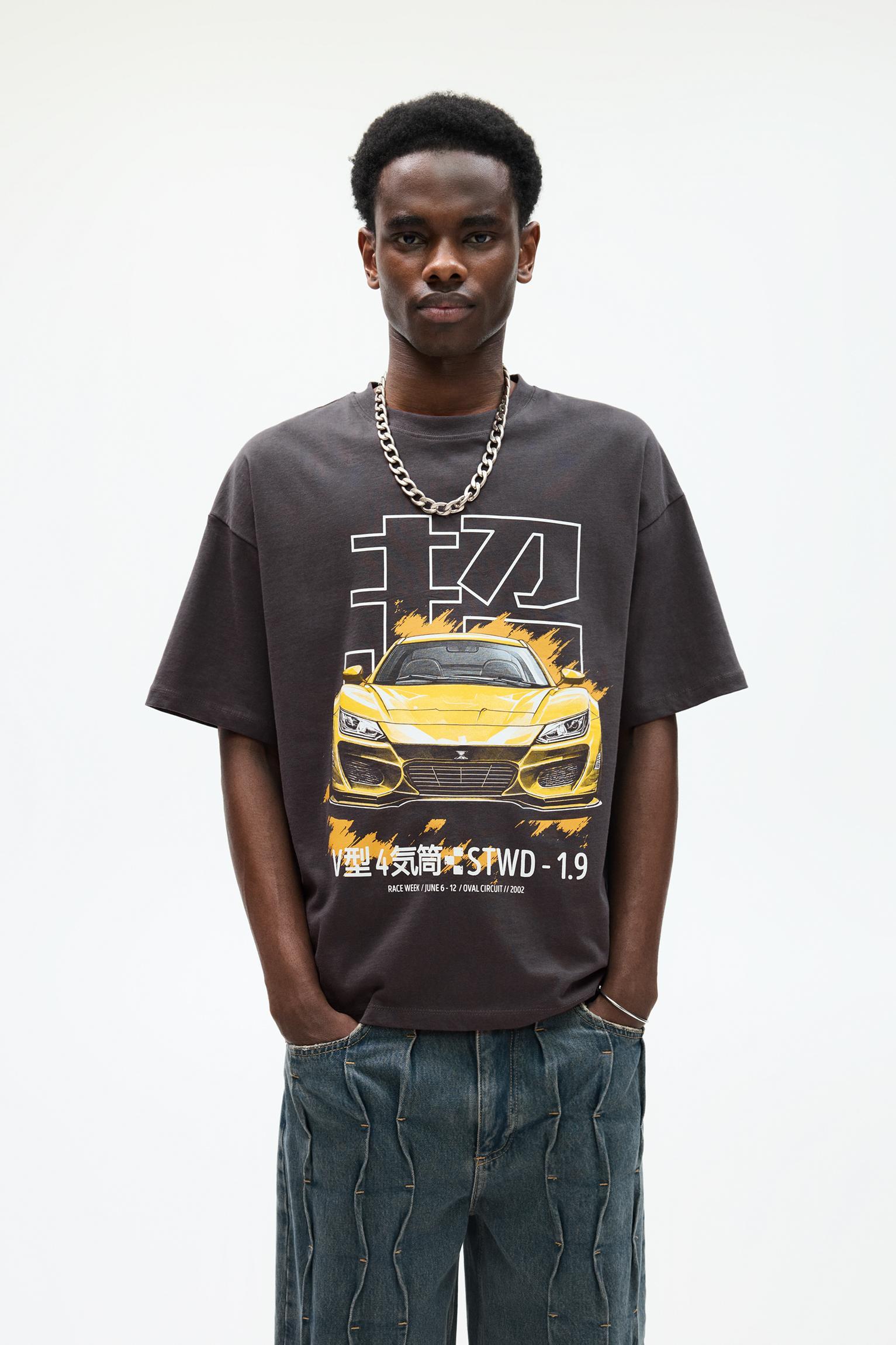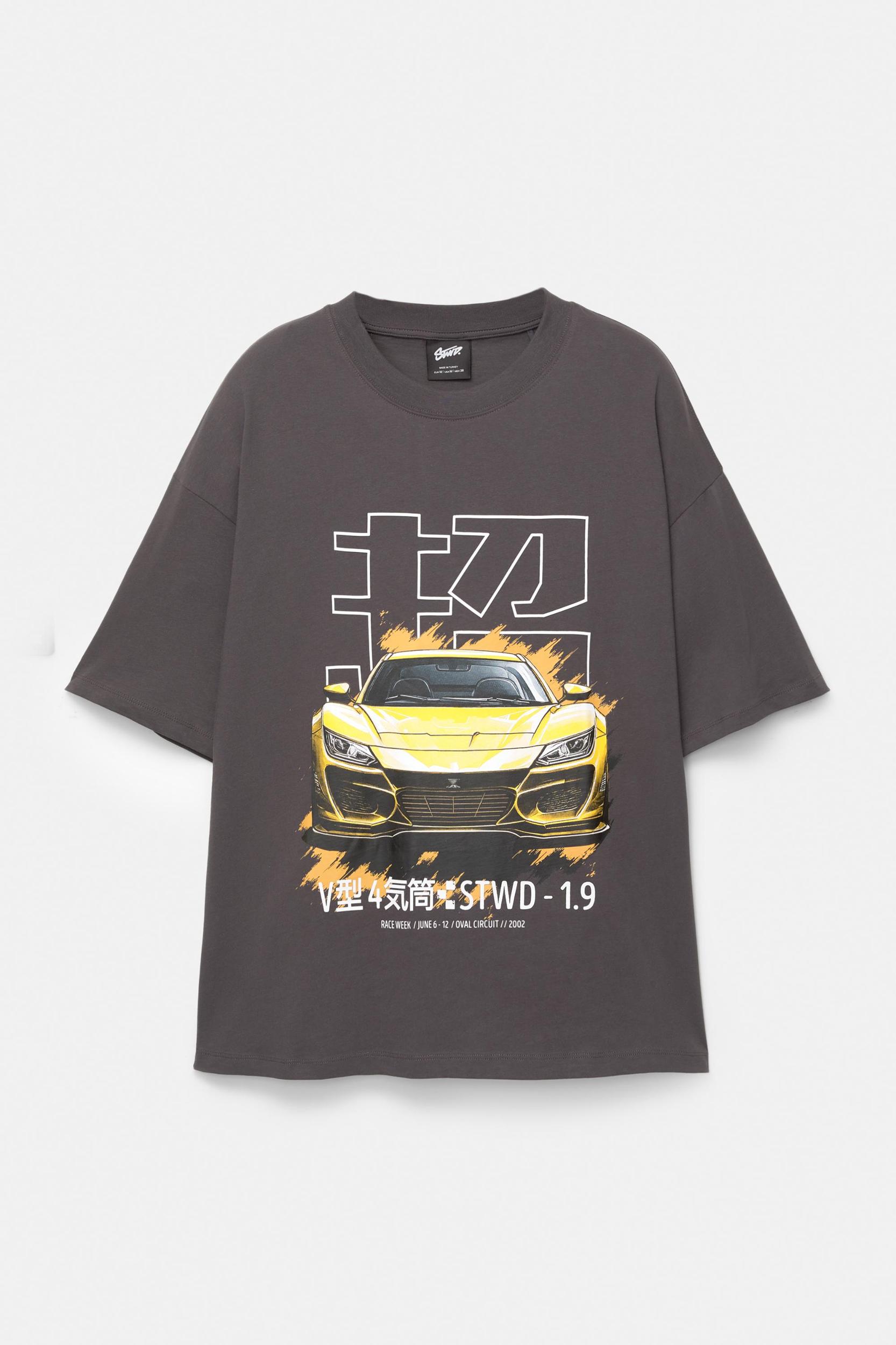 Short sleeve STWD T-shirt with a crew neck and a yellow car slogan.