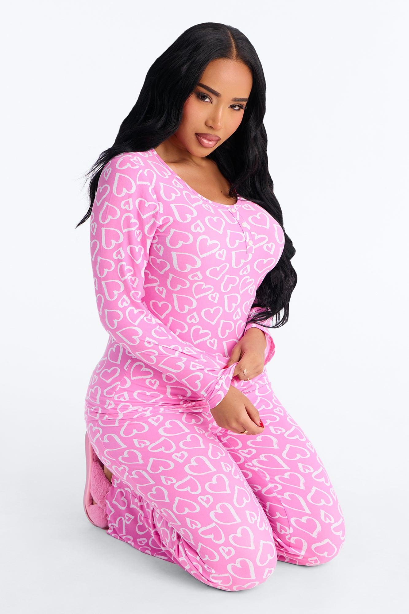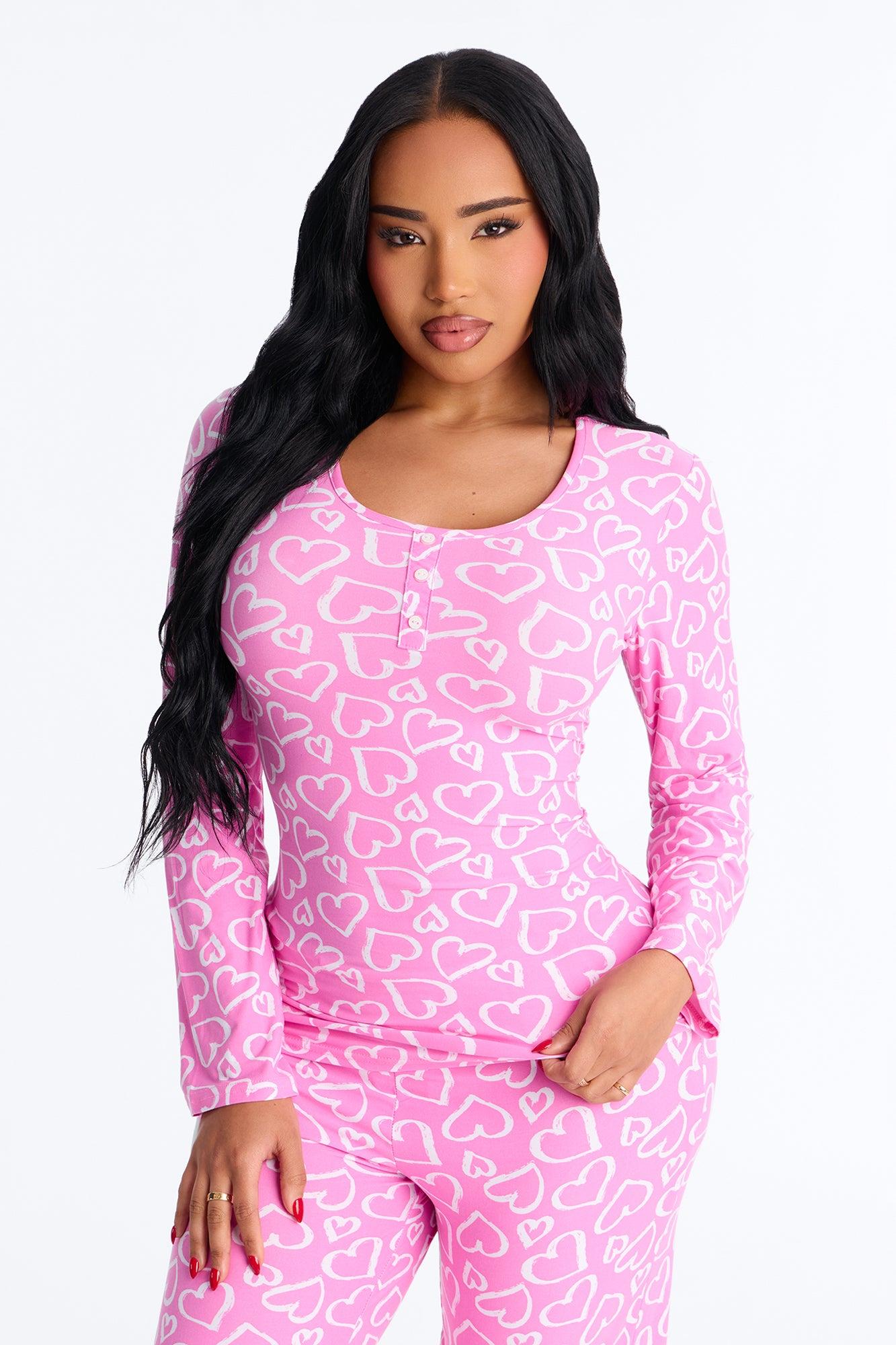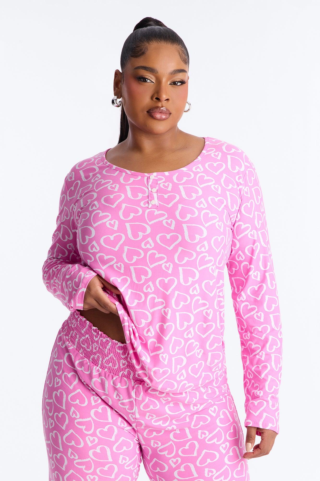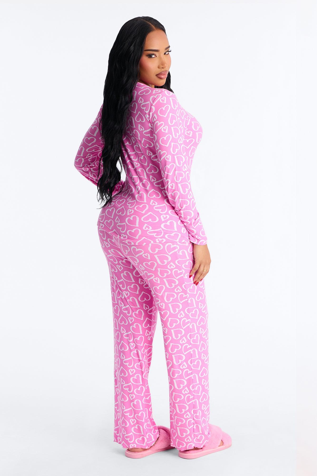 Available In Pink. PJ Pant Set Heart Print Long Sleeve Button Detail Matching Bottoms Elastic Waistband Stretch Final Sale Self : 95% Polyester 5% Spandex Imported