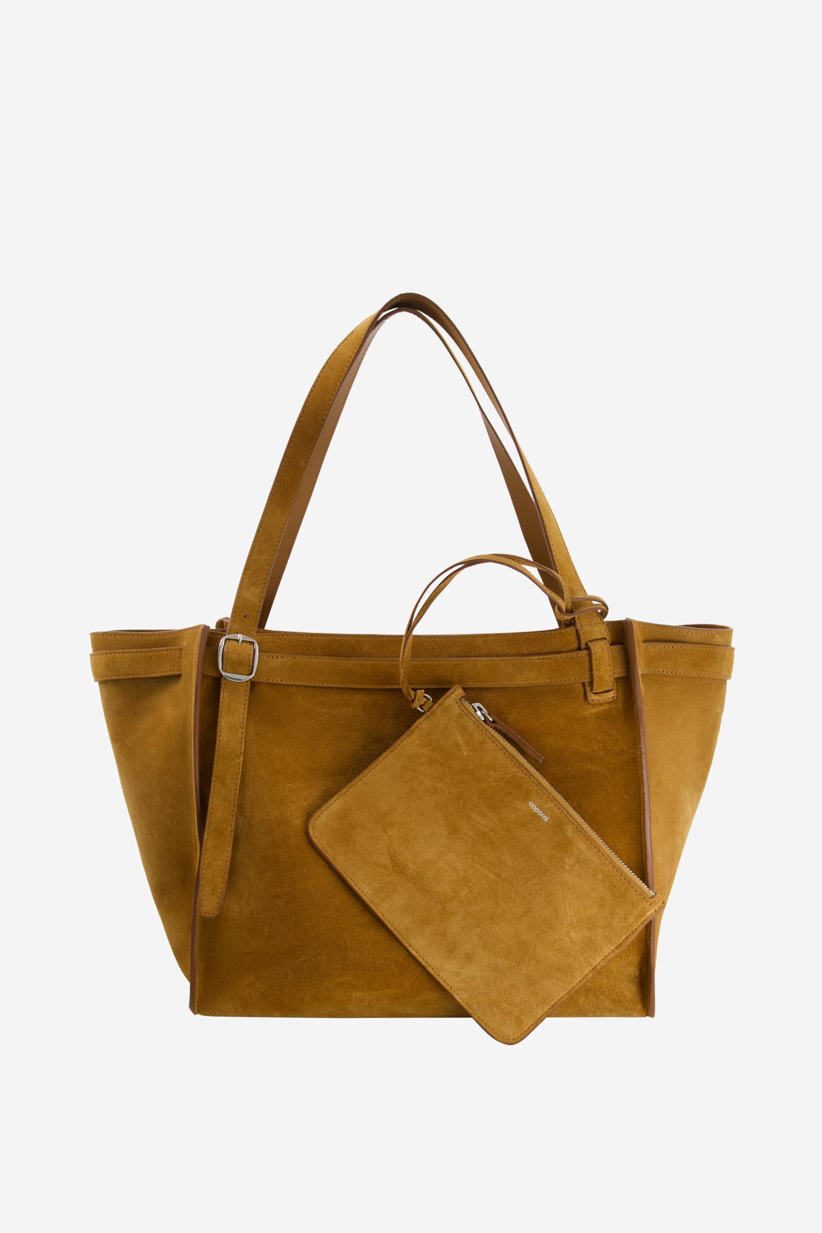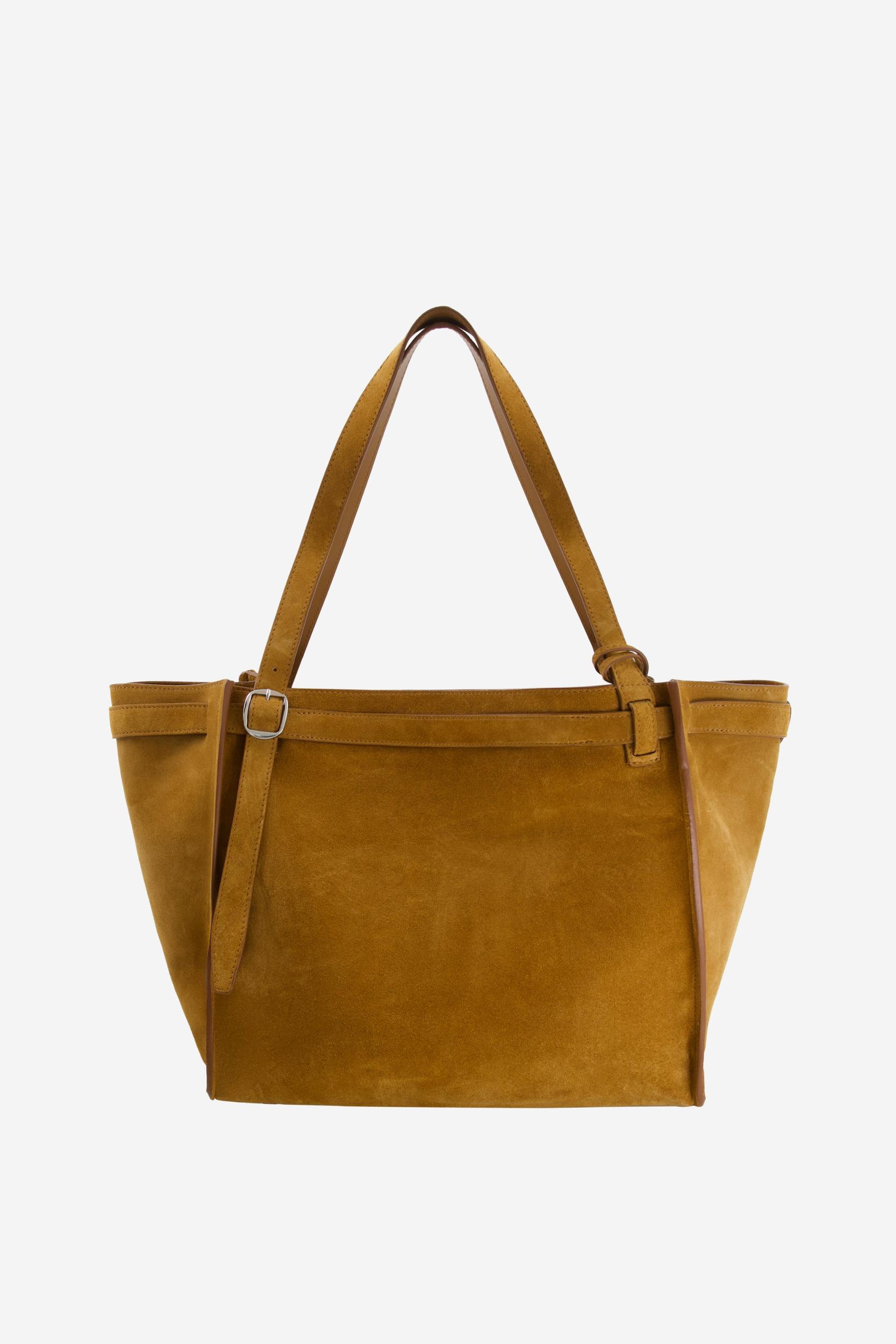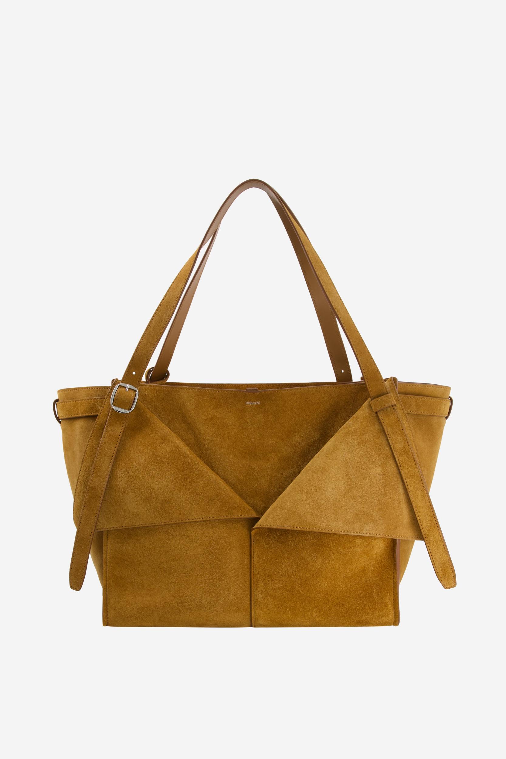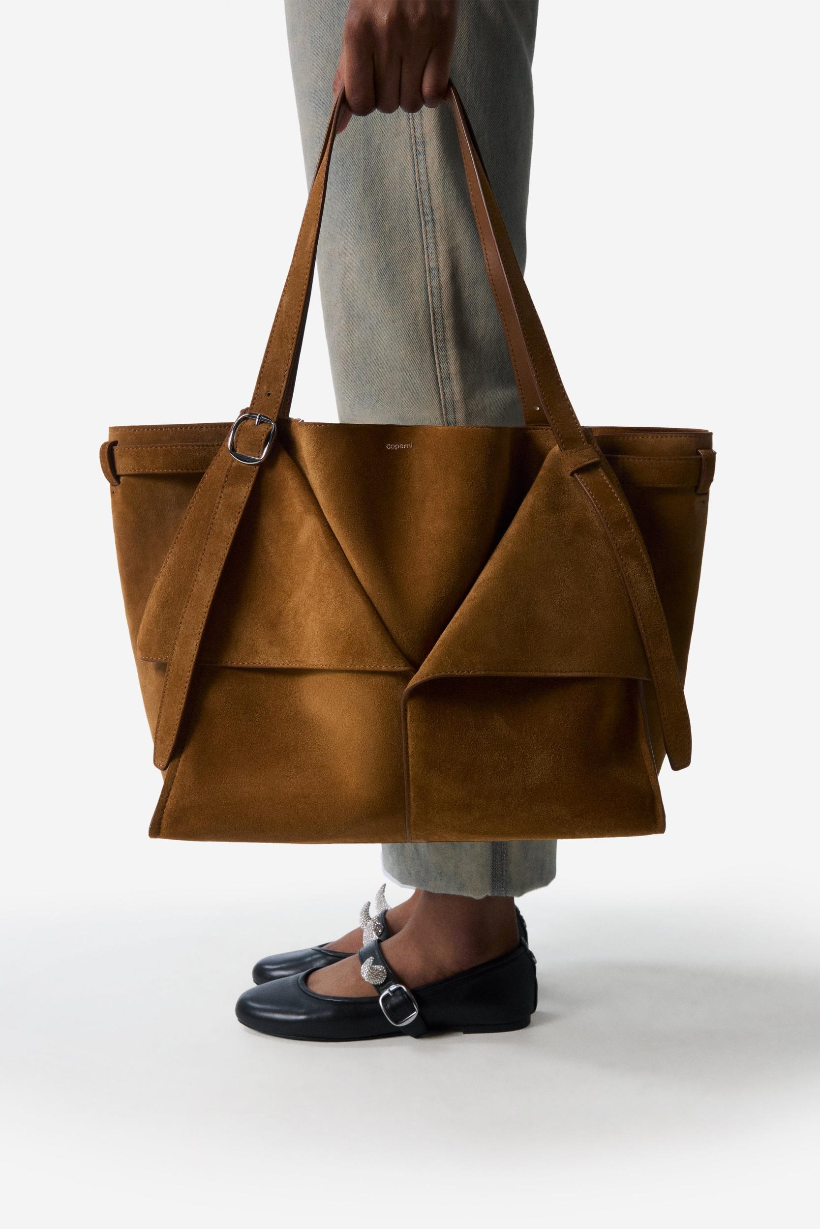 Medium size shoulder bag with folded design. Crafted from dark caramel-coloured suedeThis minimalist Cabas bag has an origami-like design using folds of suede to create a geometrically constructed style which combines the strictness of straight lights with soft tucks and curves. Generously shaped to hold all you need for the day, the bag is crafted from tactile suede in a dark caramel tone. It has slim adjustable shoulder straps inspired by a belt, complete with buckle, punch holes and tucking loop.DetailsBrownCOPBA98F6049100% Cow LeatherMade in ItalySize and Fit