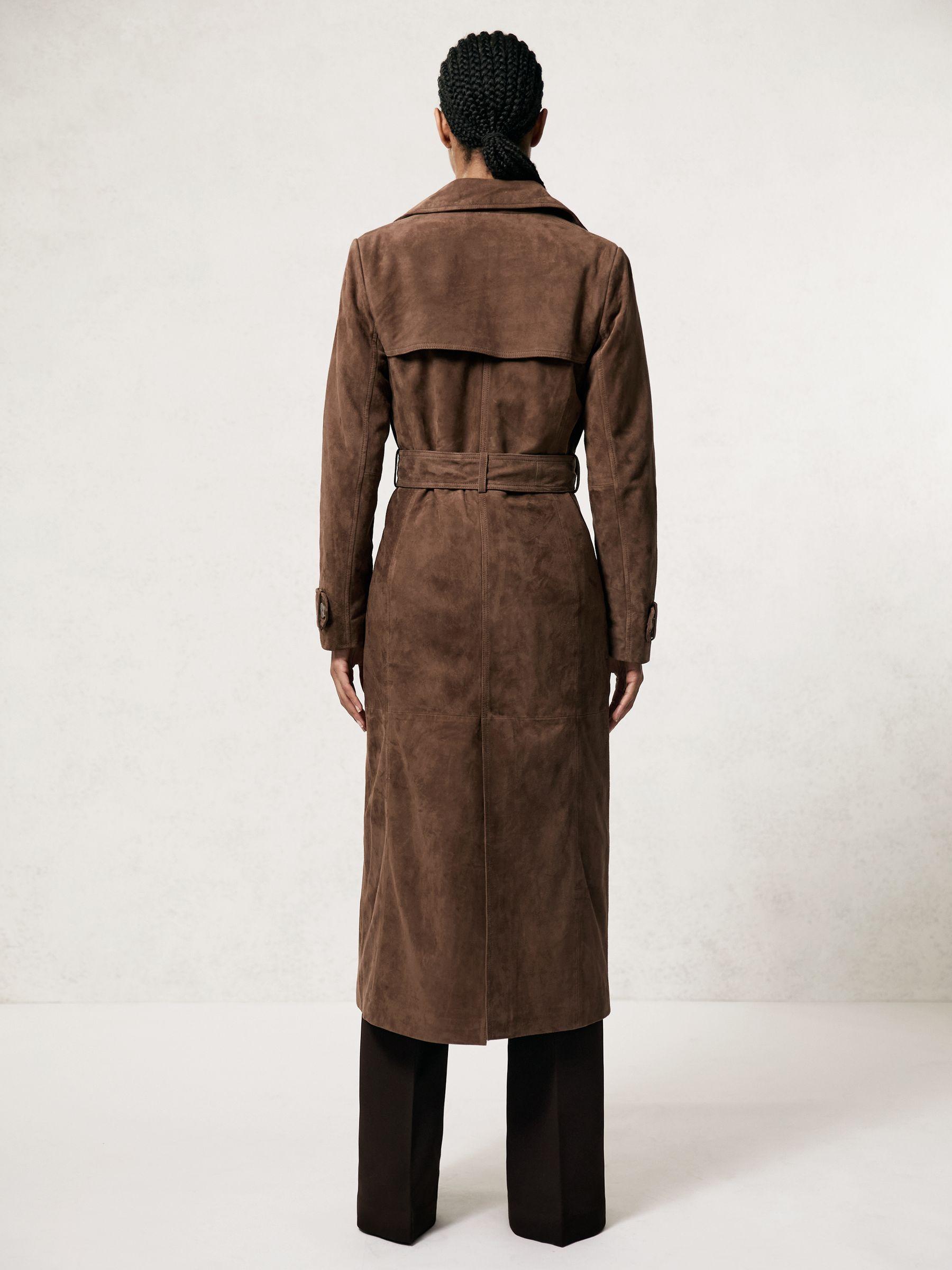 The Hattie trench coat reimagines a classic silhouette in supple suede. Cut to a longline profile, it’s tailored with a double-breasted front and softly structured notched lapels, while a matching belt cinches the waist for a refined finish. 100% suede. Double-breasted. Waist belt. Side welt pockets. Buttoned cuff straps. Lined.