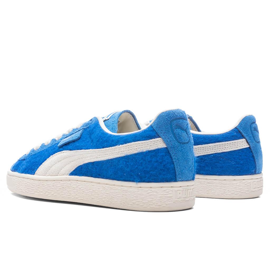 PUMA's Suede Mohair in Blue features a blend of leather and textile for a stylish upper. The hairy suede vamp, heel, and tongue add a unique texture, while the breathable synthetic collar enhances comfort. Equipped with a SOFTFOAM+ sockliner for cushioning, a rubber midsole for support, and a durable rubber outsole for traction, these sneakers combine both style and functionality. The hairy suede PUMA Formstrip completes the look, making them a standout choice for any outfit. Leather and textile upper Hairy suede vamp, heel and tongue Breathable synthetic collar SOFTFOAM+ sockliner Rubber midsole Rubber outsole Hairy suede PUMA Formstrip Style No: 398707-02