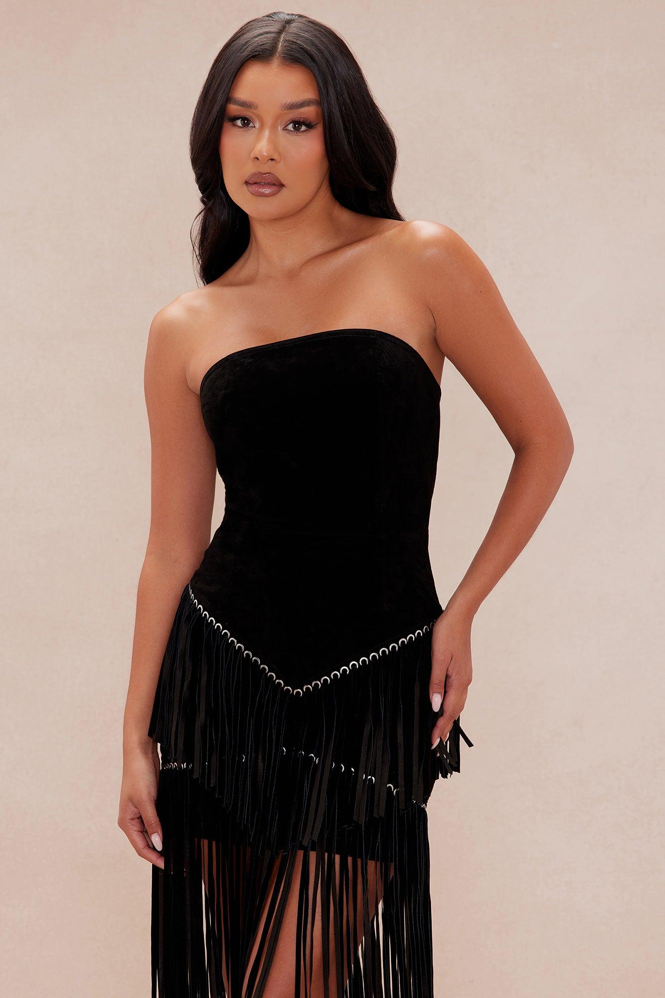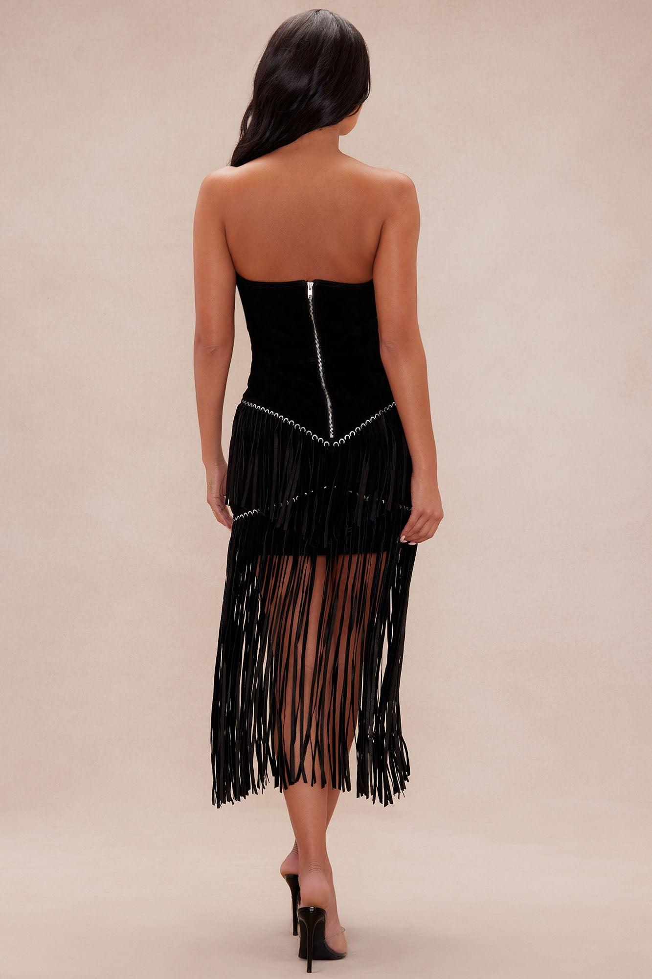 Available In Black And Brown. Suede Mini Dress Strapless Straight Neckline Back Zipper Fringe Hem Lined No Stretch Shell: 100% Leather Lining: 100% Polyester Imported California Proposition 65 WARNING: Cancer and Reproductive Harm - www.P65Warnings.ca.gov.