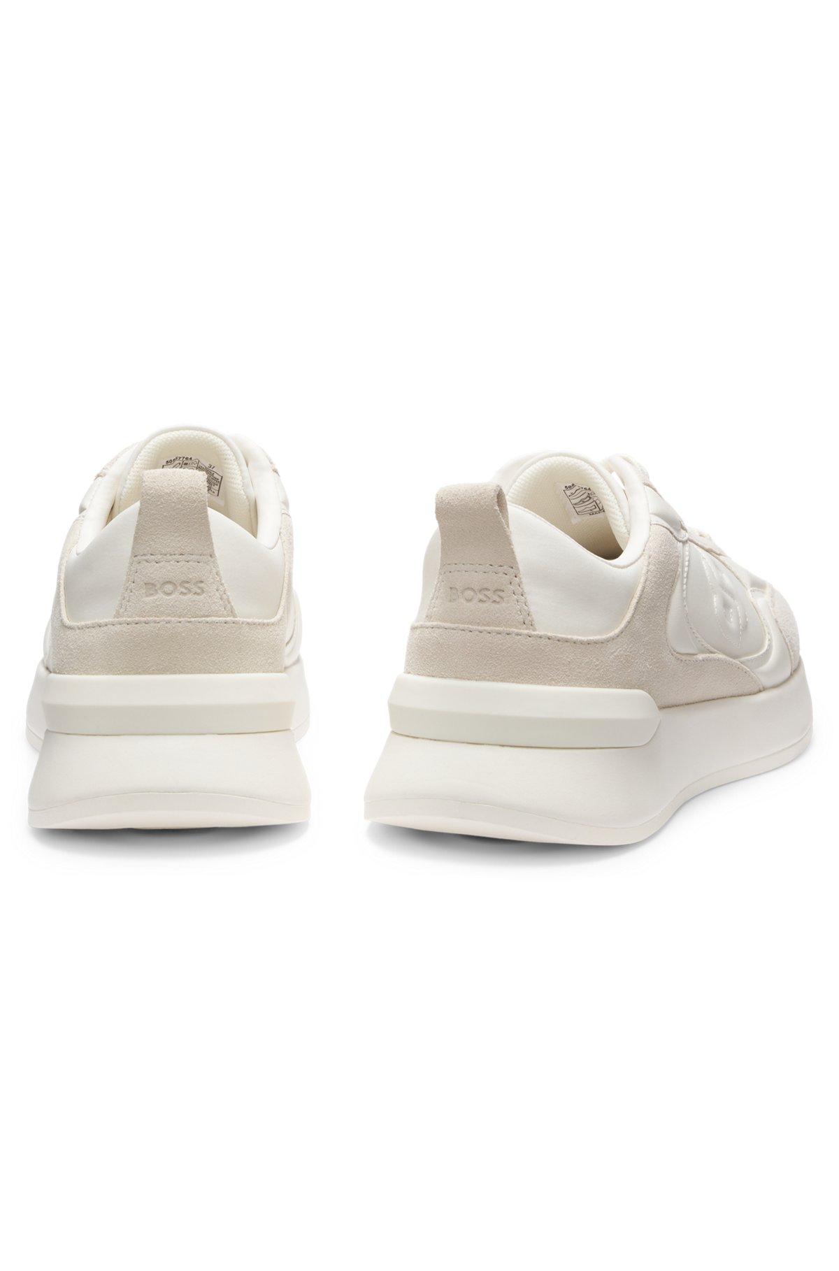 Refresh your casuals with the retro design and Double B monogram of these BOSS Womenswear trainers. Soft suede and nylon combined with synthetic coated fabric. Synthetic coated fabric, sometimes referred to as faux leather, is a fabric designed to resemble real leather, and/or display a matte, glossy, smooth, or textured, coated appearance.