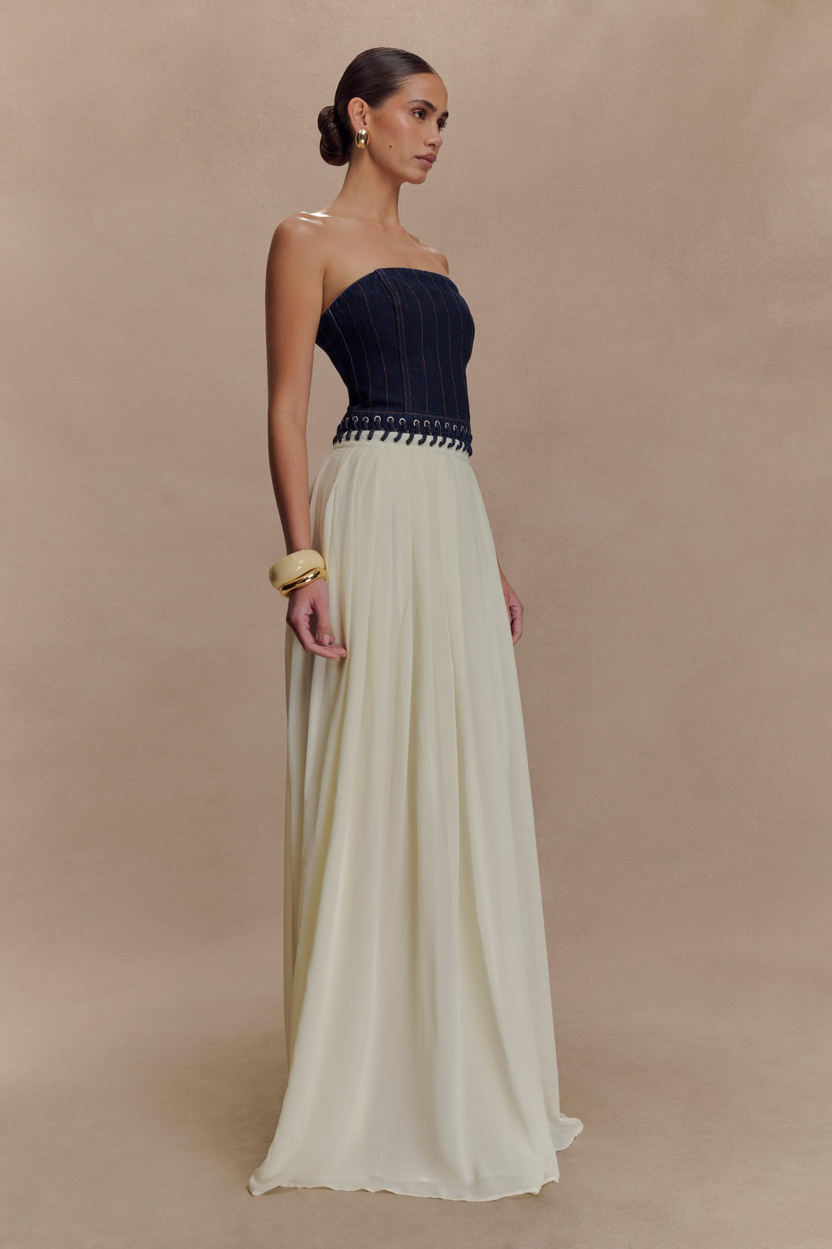Soft pleats, structured denim. The SUELLA Chiffon Denim Maxi Dress is a statement in contrast and craftsmanship. Featuring a strapless, structured denim bodice with internal grip tape for a secure fit, it’s designed to contour through the waist and flatter the bust. A pleated chiffon skirt flows effortlessly from a unique weaved eyelet waist detail, bringing soft movement to the strong denim base. Finished with a centre back zip and full-length silhouette, this dress blends edge and elegance for your next occasion moment.