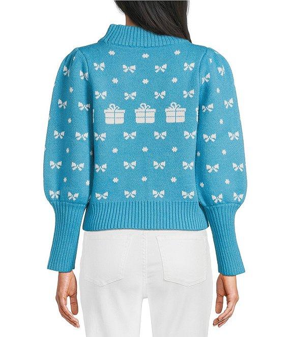 From Sugarlips, this sweater features: Soft sweater knit fabrication Gift and bow motif pattern Mock neckline Long puff sleeves Pullover construction Approx. 20.25" length Acrylic/nylon Hand wash Imported.