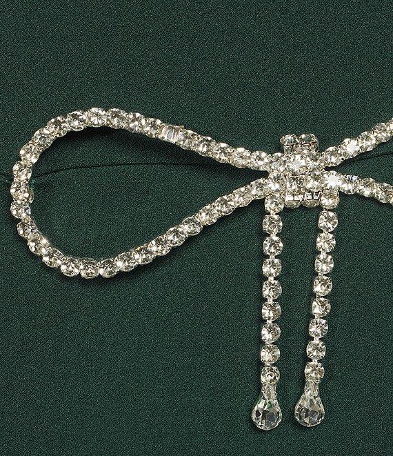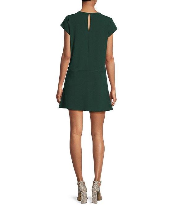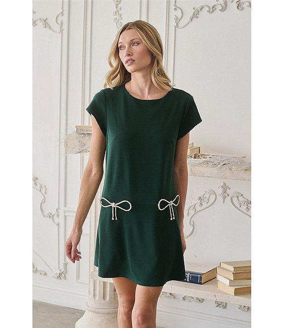 From Sugarlips, this dress features: Stretch knit fabrication Crew neckline Cap sleeves Pull-over construction Back key hole detail Rhinestone bows at front hip Mini length Approx. 34" length Self: Polyester/spandex Lining: polyester Hand wash Imported.