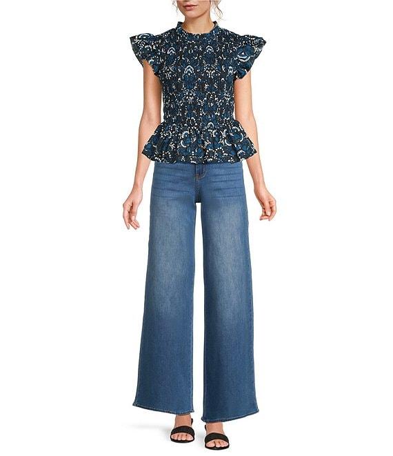 Sugarlips Etta Floral Print Mock Neckline Short Sleeve Smocked Peplum Top