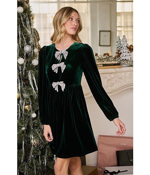 From Sugarlips, this dress features: Velvet fabrication Crew neckline Long sleeves Rhinestone bow detail Back zipper closure Lined Approx. 35" length Polyester/spandex Hand wash Imported.
