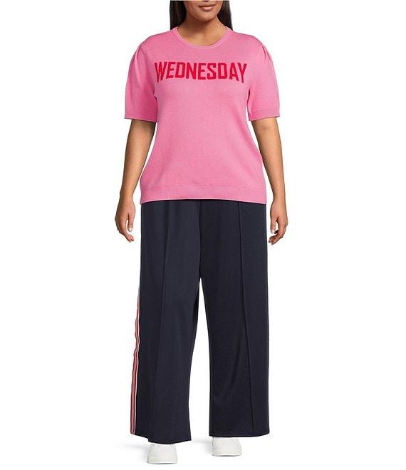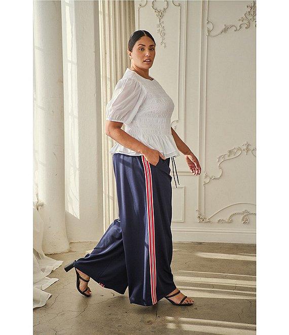 From Sugarlips, these pant features: Track pant silhouette Shimmer side stripe Elastic drawstring waist Wide legs Side pockets Pintuck detail Relaxed fit Pull-on construction Approx. 31" inseam Self: Polyester/spandex Trim: polyester Hand wash Imported.