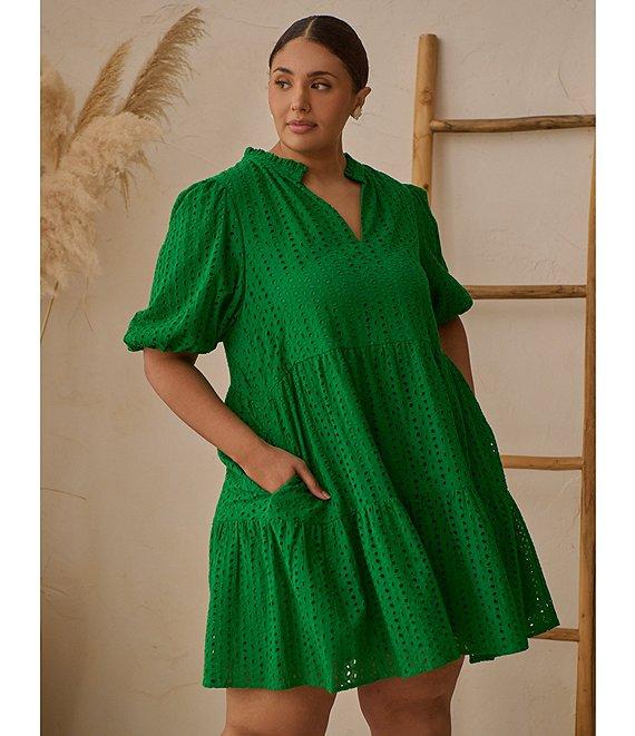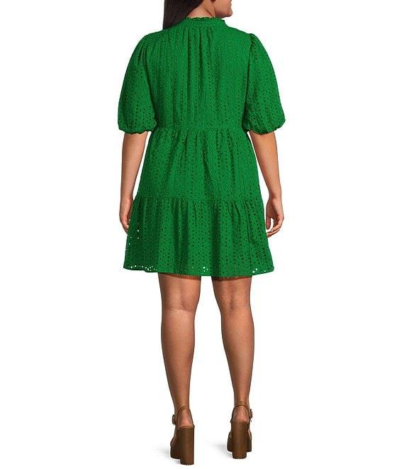 From Sugarlips Plus, this dress features: Solid floral eyelet Ruffled split neck Short sleeves Tiered skirt Short shift dress Pull-on styling Polyester Lining of polyester/spandex Hand wash Imported.
