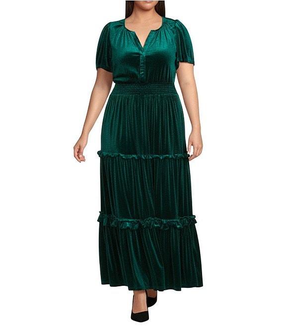From Sugarlips Plus, this dress features: Velvet fabrication A-line silhouette Split v-neckline Short sleeves Pullover construction Side seam pockets Smocked waist Tiered skirt Fully lined Straight hemline Approx. 59" length Polyester/spandex Lining: polyester Hand wash Imported.
