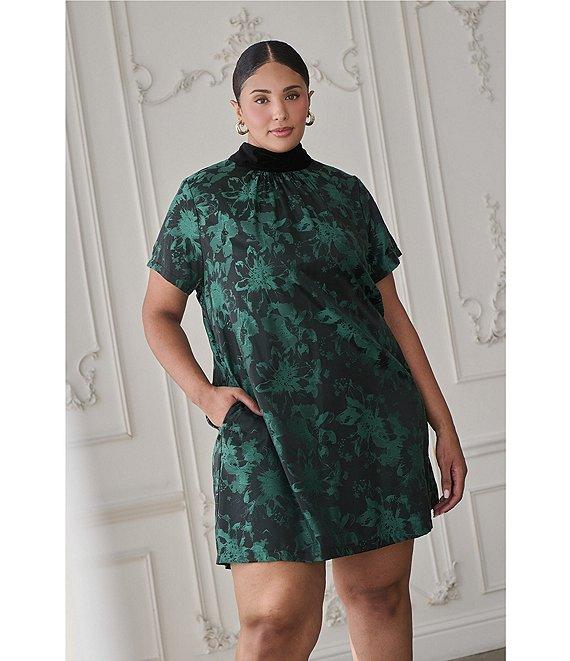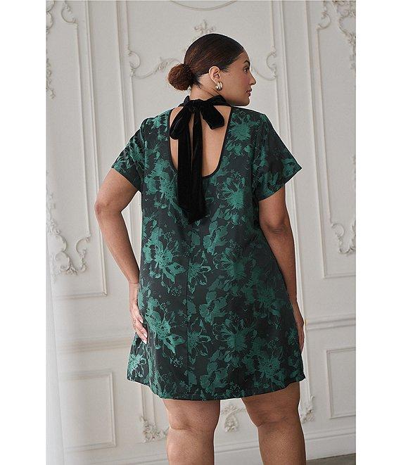 Sugarlips Plus Size Floral Jacquard Velvet Bow Tie Mock Neck Mini Dress