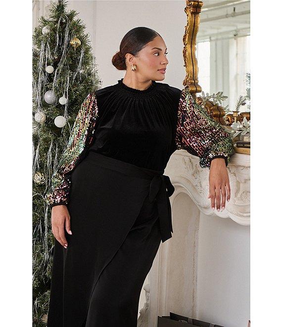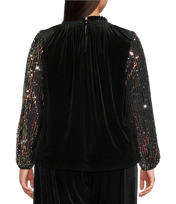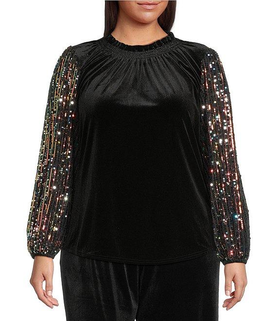 From Sugarlips Plus, this top features: Velvet fabrication Blouse silhouette Mock neckline Long sequin sleeves Pullover construction Ruffle trim at neckline Smocked neckline detail Lined Straight hemline Approx. 28.5" length Polyester/spandex Lining: polyester Hand wash Imported.