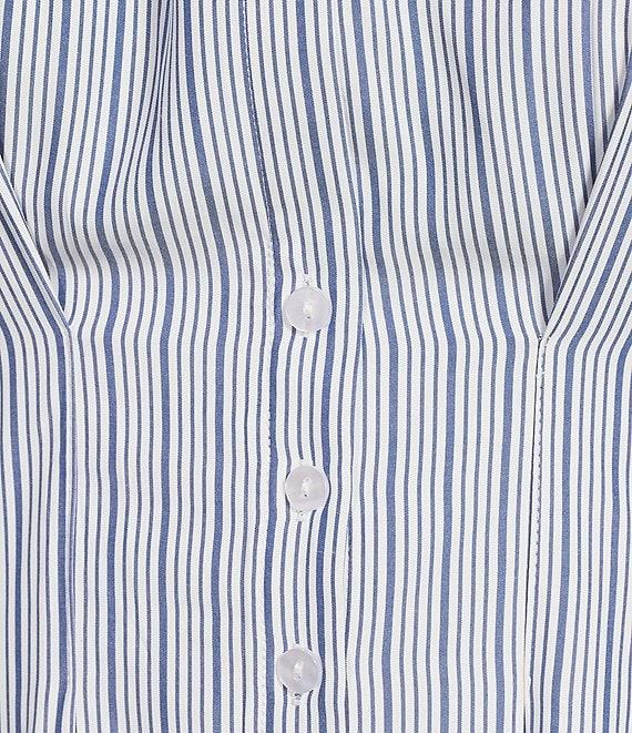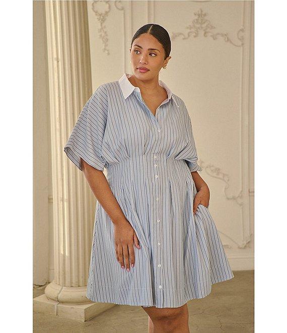 From Sugarlips Plus, this dress features: Stripe print Contrast collared neckline Short sleeves Button front closure Side pockets Pleated detail Smocked back detail Lined Approx. 41" length Self: Polyester/cotton Contrast: cotton Lining: cotton Hand wash Imported.