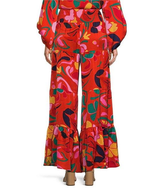 Sugarlips Satin Tropical Abstract Print Smocked High Waisted Wide Leg Coordinating Pull-On Pants