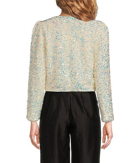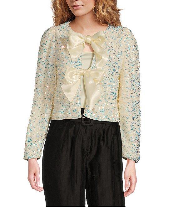From Sugarlips, this jacket features: Sequin fabrication Crew neckline Long sleeves Functional front satin bow ties Lined Pull-on construction Approx. 18.75" length Polyester Hand wash Imported.