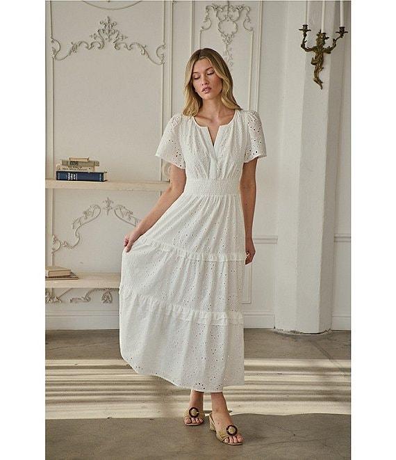 From Sugarlips, this dress features: Embroidered eyelet fabrication V-neckline Short sleeves Side seam pocket detail Smocked waist detail Contrast embroidery detail Missy: 35" length Self: cotton Lining: polyester/spandex Hand wash Imported.