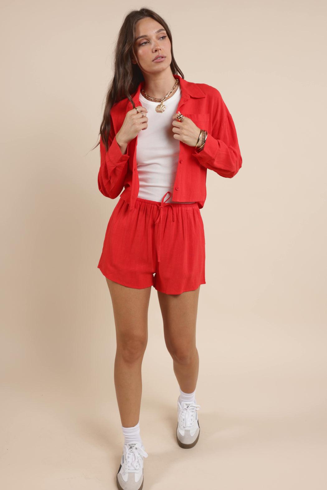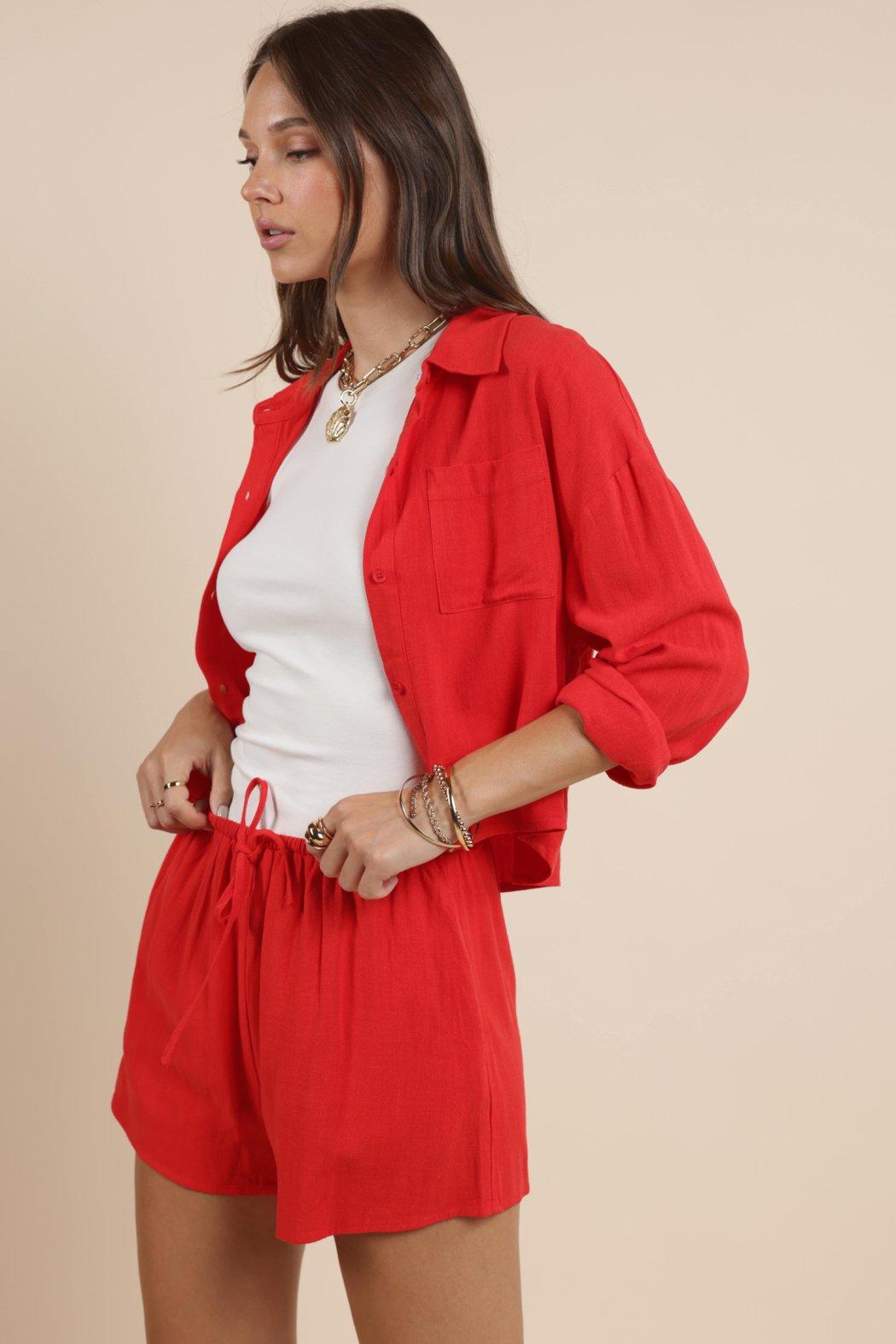 Turn heads in this stunning two-piece set featuring a short linen red blouse and matching high-waisted shorts. Crafted from breathable, lightweight linen, the blouse boasts a relaxed fit with short sleeves and a button-down front, blending comfort with casual elegance. Paired with tailored matching shorts, this coordinated look is perfect for warm-weather days, beach strolls, or weekend brunches. The vibrant red hue adds a bold, confident touch to your summer wardrobe.