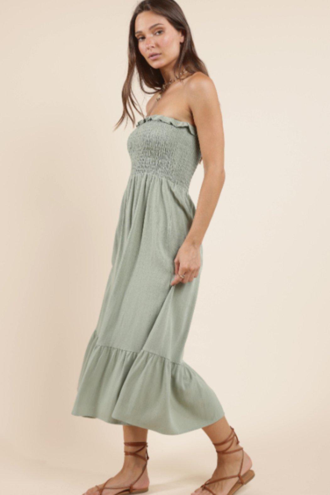 Breezy, romantic, and effortlessly refined. This midi dress features a smocked bodice that hugs in all the right places, flowing into a soft linen skirt with tiered ruffle detailing. Lightweight and breathable with a flattering silhouette, it’s your go-to for sun-soaked days and warm evening escapes.
